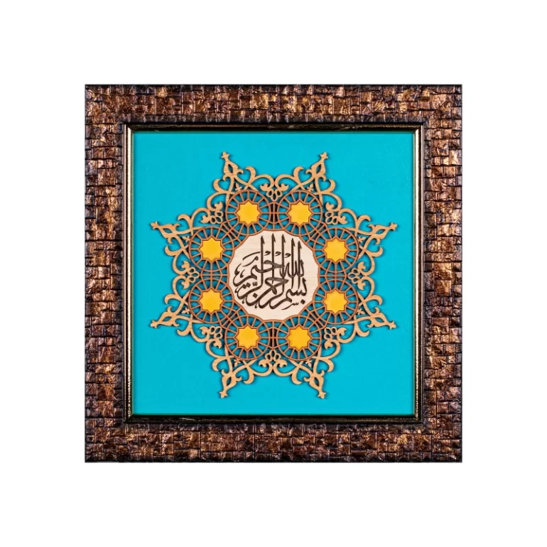 تابلو معرق طرح خاتم بسم الله الرحمن الرحیم مدل TA05؛ یک تابلو نفیس و بسیار ارزشمند که با دقت بسیار شگفت آوری برش خورده و در بستری چرمی به رنگ فیروزه ای، نقش بسم الله الرحمن الرحیم را به صورت اسلیمی نقش زده است. این تابلو در فریم قاب PVC برجسته ارائه میشود. ابعاد این تابلو با قاب آن 25*25 سانتی متر میباشد.