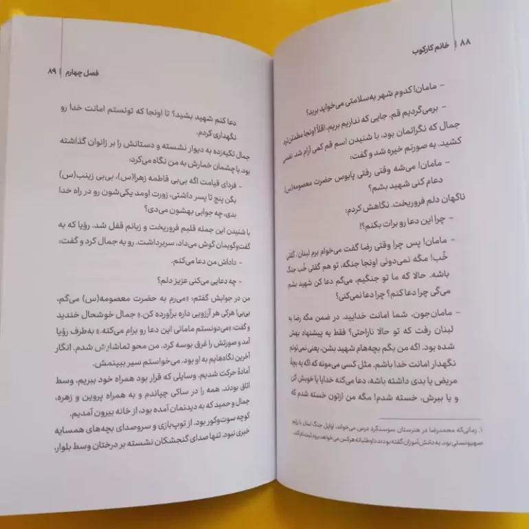زهرا کارکوب‌زاده در بخشی از کتاب می‌گوید: «مادری که در جنگ، تنها خدا را می‌بیند، هیچ چیزی نمی‌تواند او را شکست دهد.» این جمله، روحیه ایستادگی، امید و ایمان به خداوند را در برابر سخت‌ترین چالش‌ها نشان می‌دهد. همچنین، او در قسمتی دیگر از کتاب بیان می‌کند: «وقتی اولین پسرم را به جبهه فرستادم، هیچ‌گاه فکر نمی‌کردم روزی با سه پسر شهید و دو جانباز روبه‌رو شوم، اما ایمان داشتم که باید راهی که انتخاب کرده‌اند را ادامه دهند.»