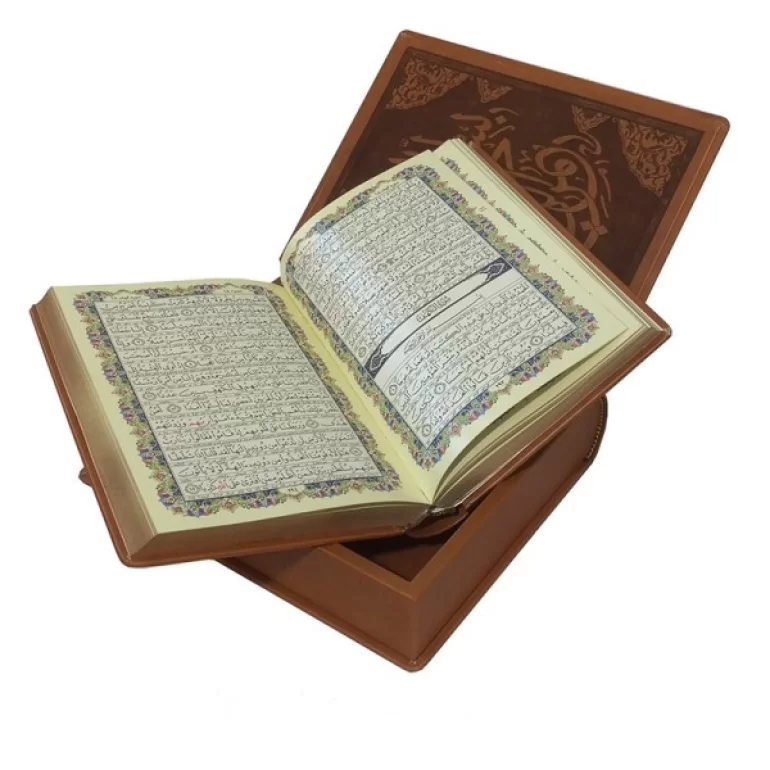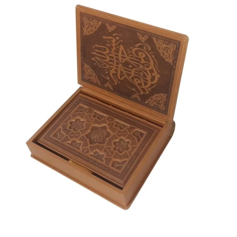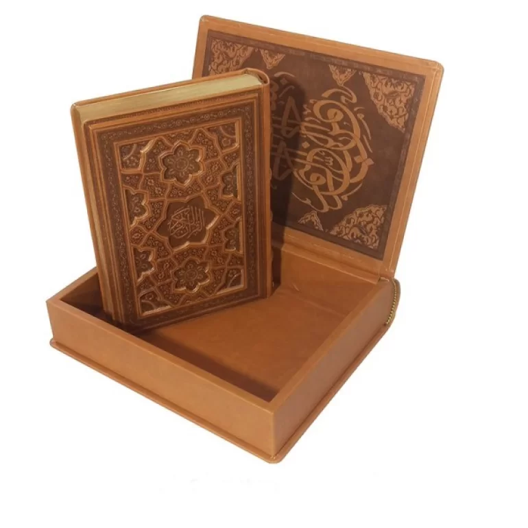 ست جعبه و قرآن چرم مصنوعی رنگ قهوه ای قاب بازشو جلد برجسته کاغذ قرآن گلاسه ی مطعر