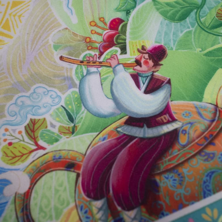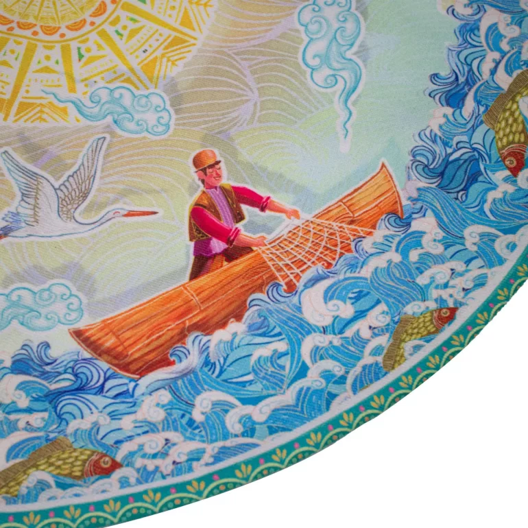 تصاویرِ دلنشین رومیزی گرد گیلان با الهام از سرزمینهای سرسبزِ شمالِ ایران کشیده شده است و بهشیوۀ چاپ سابلیمیشن روی پارچۀ مخمل نقش بسته است. قطر این رومیزی 45 سانتیمتر میباشد.