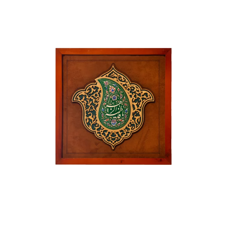 این قاب از مجموعهای است نفیس از هنرهای اصیل ایرانی مانند خوشنویسی، میناکاری، قابسازی و... . در ساخت این محصولات سعی شده از زبدهترین اساتید شهر اصفهان و بهترین مواد اولیه استفاده شود. این قاب از برنج، مینا، چرم و چوب طبیعی ساخته شده است. ابعاد قاب 30 * 30 سانتیمتر است.