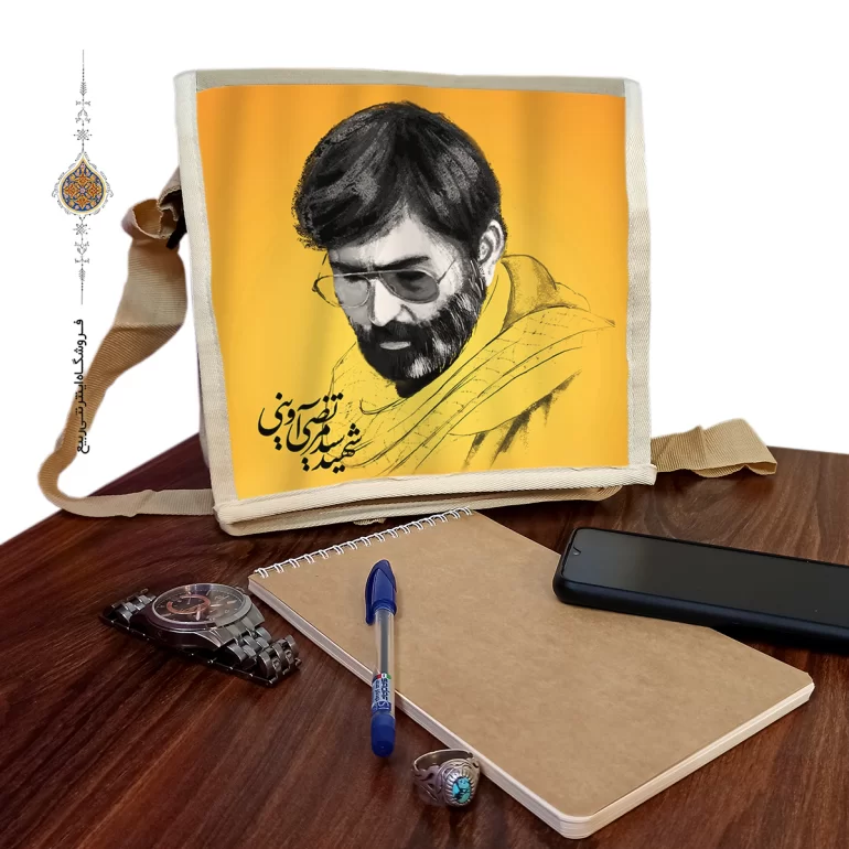کیف دوشی برزنتی با طرح چهره سر به زیر شهید آوینی