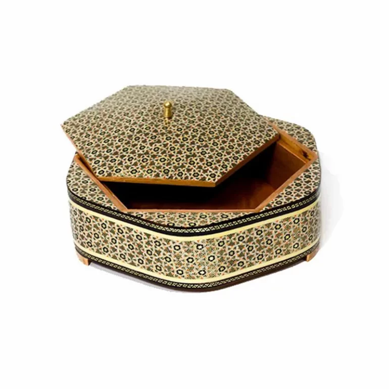 شکلات خوری خاتم کاری و خراطی مدل پروانه تو راش، در ابعاد 20*20 سانتی متر میباشد. این محصول هم به عنوان شکلات خوری و هم به عنوان قندان استفاده میشود. توجه کنید که شستن این شکلات خوری فقط با دستمال خشک امکان پذیر است. این شکلات خوری توسط هنرمندان اصفهان ساخته و پرداخته شده و به لحاظ کیفیت، کالایی ارزشمند و نفیس خواهد بود.