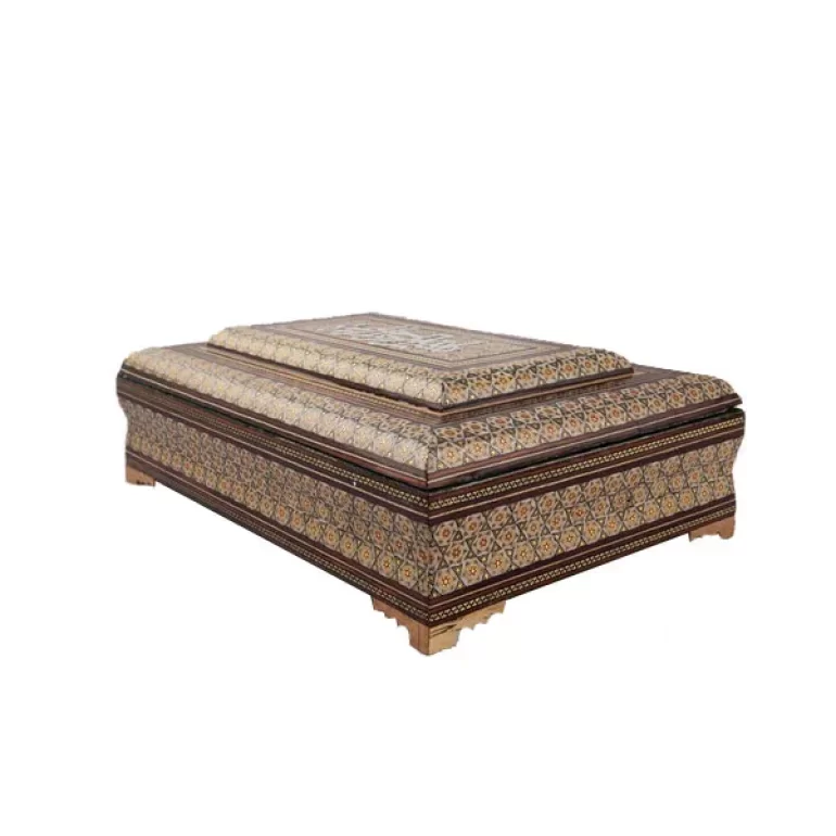 خاتمکاری از هنرهای ظریفه و صنایع دستی ایران است که سابقه و ریشهای کهن دارد. خاتم کاری هنر قرار دادن نقوش هندسی با اضلاع مثلثی در کنار هم است که با ظرافت و دقت خاصی باید کاملا به هم چسبیده باشند. طرحهای گوناگون خاتم همواره به صورت اشکال منظم هندسی بوده است. این اشکال هندسی را با قراردادن مثلثهای کوچک در کنار هم نقشبندی میکنند. جعبه قرآن خاتم طرح رو خاتم بسم الله، در ابعاد 32*22 سانتی متر میباشد. این محصول، جعبه ای است برای نگهداری از قرآن نفیسی که شما آن را مطالعه میکنید. این جعبه توسط هنرمندان اصفهان ساخته و پرداخته شده و به لحاظ کیفیت، کالایی ارزشمند و نفیس خواهد بود.
