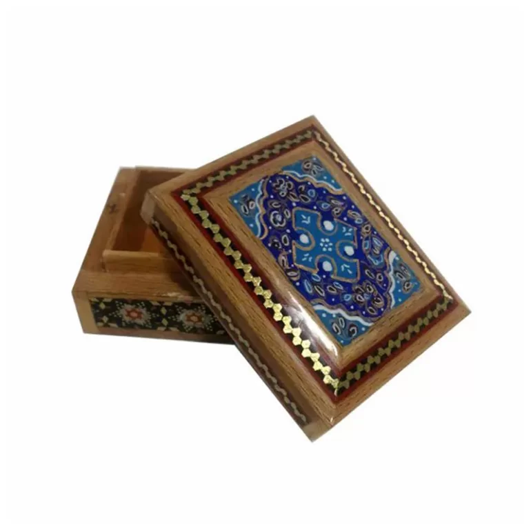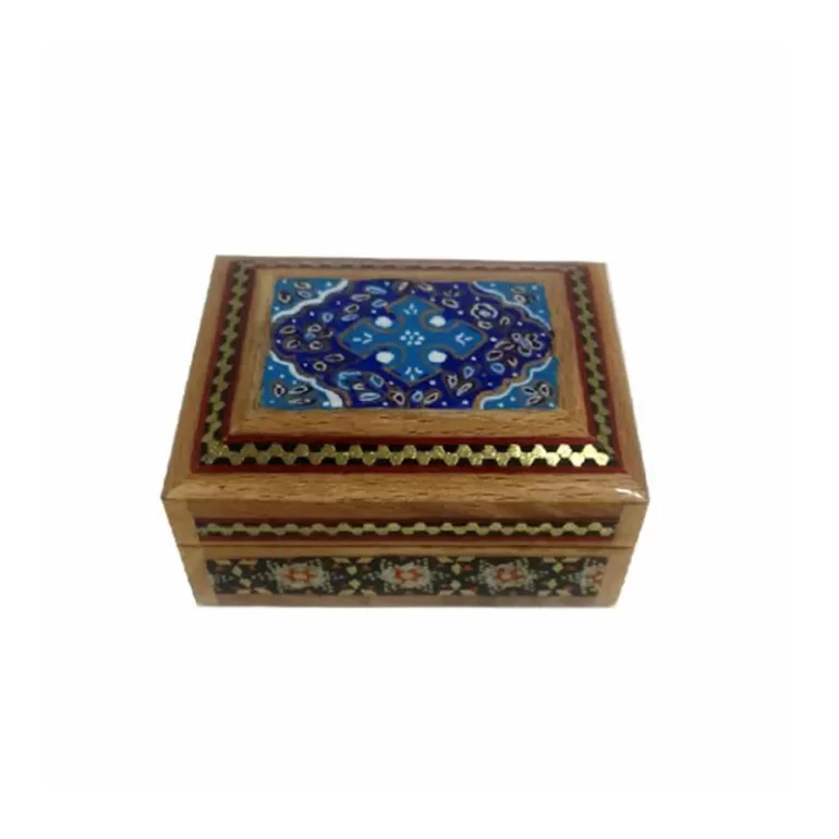 خاتمکاری از هنرهای ظریفه و صنایع دستی ایران است که سابقه و ریشهای کهن دارد. خاتم کاری هنر قرار دادن نقوش هندسی با اضلاع مثلثی در کنار هم است که با ظرافت و دقت خاصی باید کاملا به هم چسبیده باشند. طرحهای گوناگون خاتم همواره به صورت اشکال منظم هندسی بوده است. این اشکال هندسی را با قراردادن مثلثهای کوچک در کنار هم نقشبندی میکنند. جعبه جا سکه ای خاتم، در ابعاد 3*6*5 سانتی متر و با وزن 50 گرم میباشد. این جعبه، توسط هنرمندان اصفهان ساخته و پرداخته شده و به لحاظ کیفیت، کالایی ارزشمند و نفیس خواهد بود. توجه داشته باشید که شستن این جعبه فقط با دستمال خشک صورت میگیرد.