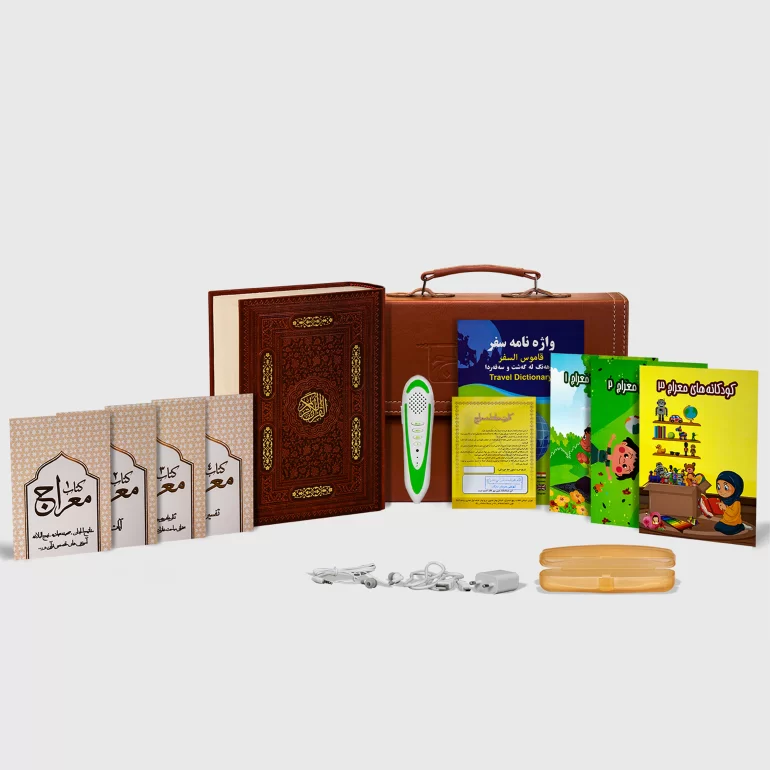 کیف چرم – کتاب قرآن خط عثمان طه درشت خط با ترجمه انصاریان -کتابچه های معراج4،3،2،1 – کتابچه های کودکانه های معراج3،2،1- قلم 32 گیگ با قابلیت ارتقا – کارت گارانتی – کابل شارژ – آداپتور – هندزفری