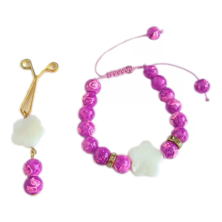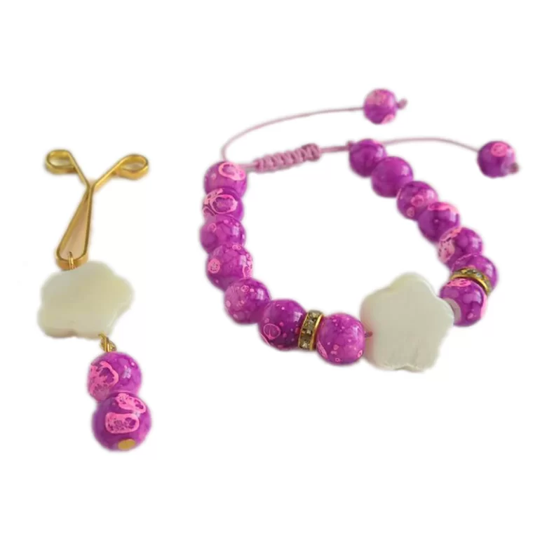 ست دستبند و گیره روسری طرح آفرین(بنفش)، کاری خاص و دوست داشتنی برای دختران و بانوان. این ست زیبا کار دست بانوان ایرانی، درست شده از مهره های رگه دار بنفش و گل صدفی به همراه گره کشویی می‌باشد.