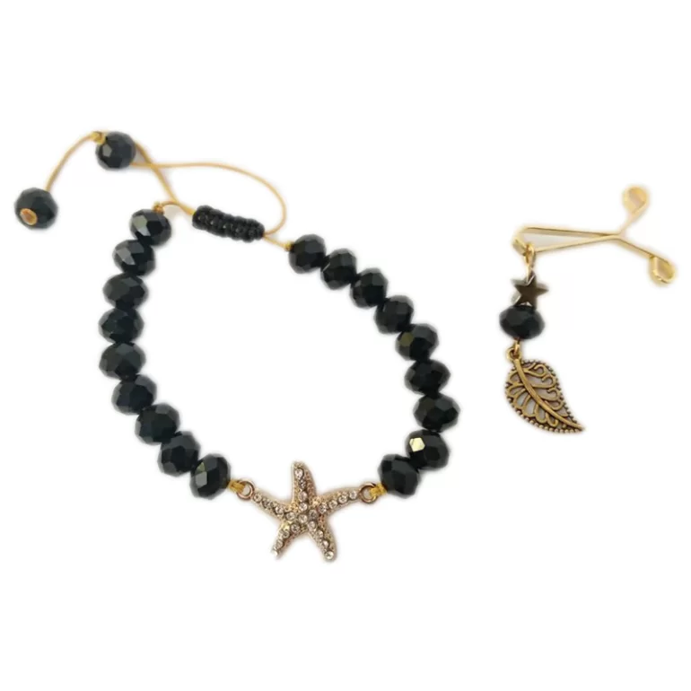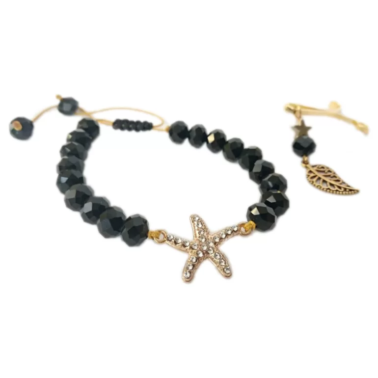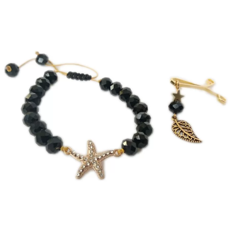 کاری زیبا و مناسب محرم برای بانوان خاص پسند. این کار متفاوت ترکیبی از مهره های کریستال مشکی و پلاک ستاره نگینی به همراه گره کشویی مناسب برای بانوان با سلیقه است.