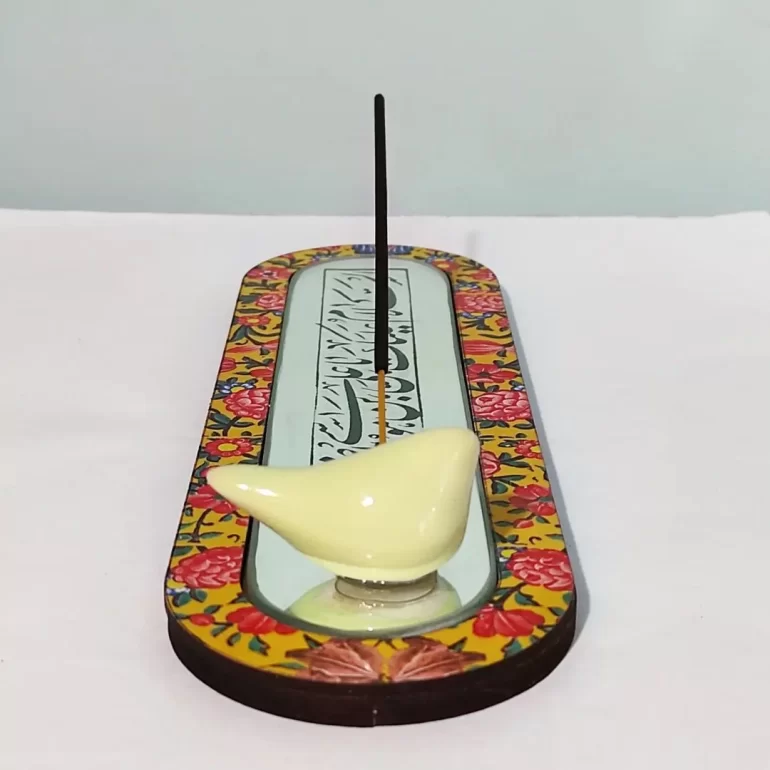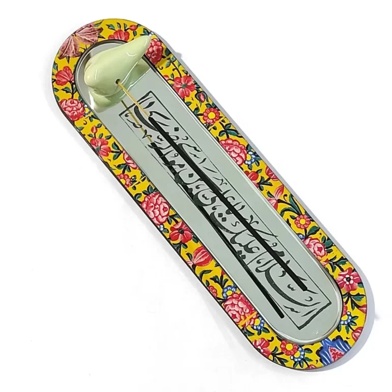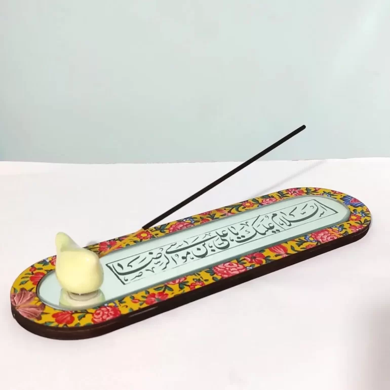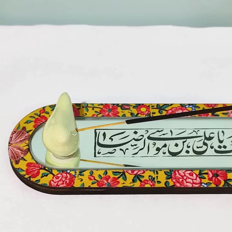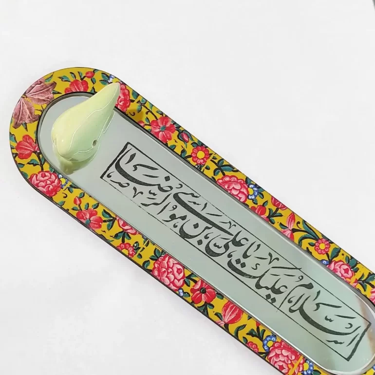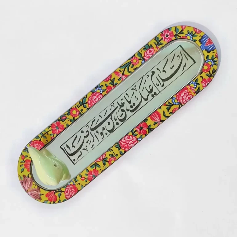 آینه آنتیک مزین به ذکر السلام علیک یا علی بن موسی الرضا؛ محصولی بسیار زیبا و شیک برای دکور و تزئین خانه یا محل کارتان است. ابعاد این محصول 27*8 سانتیمتر بوده و همراه با جای عود میباشد.