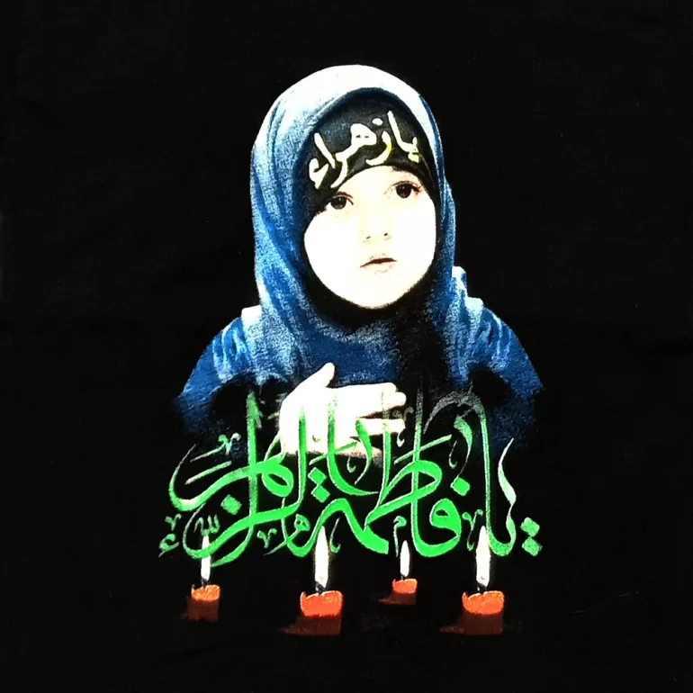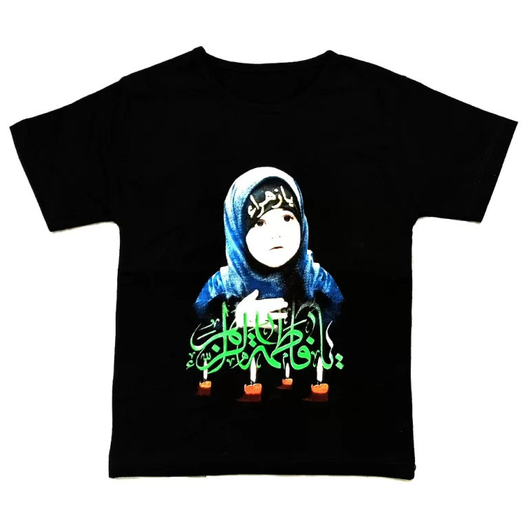 تیشرت کودکانه با ذکر یا فاطمه الزهرا (س) به رنگ مشکی، که طرحی کودکانه روی آن به صورت چاپ سیلک حک شده است. این تیشرت از پارچه پنبه ای تولید شده که بدن کودک را آزار ندهد. کیفیت چاپ سیلک تضمین شده و ماندگاری طولانی مدتی خواهد داشت. این تیشرت هم اکنون با سایز 40 آماده عرضه است.