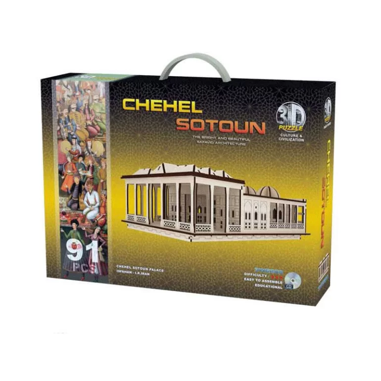 پازل سه بعدی چوبی کاخ چهلستون اصفهان بازی جذاب ساختنی دارای 91  قطعه می باشد و می‌تواند به عنوان يك سرگرمی آموزنده برای تمامی اعضای خانواده مورد استفاده قرار گيرد.اين پازل، يك محصول كمك آموزشی است كه برای آموزش نقشه‌خوانی، ايجاد تفكر هندسی، افزايش خلاقيت وآشنايی كودكان و نوجوانان با بناهای تاريخی ايران و ویژگی های معماری آثار باستانی طراحی شده است. تقویت هویت ملی ، تقویت حس کنجکاوی، افزایش دقت و تمرکز در کودکان و نوجوانان از مزایای ساخت این پازل سه بعدی می باشد.