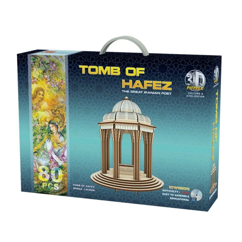 پازل سه بعدی چوبی آرامگاه حافظ ( حافظیه ) شیراز بازی جذاب ساختنی دارای 80 قطعه می باشد و میتواند به عنوان يك سرگرمی آموزنده برای تمامی اعضای خانواده مورد استفاده قرار گيرد.اين پازل، يك محصول كمك آموزشی است كه برای آموزش نقشهخوانی، ايجاد تفكر هندسی ، افزايش خلاقيت وآشنايی كودكان و نوجوانان با بناهای تاريخی ايران و ویژگی های معماری آثار باستانی طراحی شده است. تقویت هویت ملی ، تقویت حس کنجکاوی، افزایش دقت و تمرکز در کودکان و نوجوانان از مزایای ساخت این پازل سه بعدی می باشد.