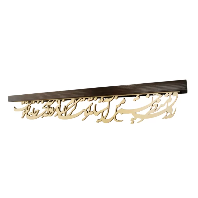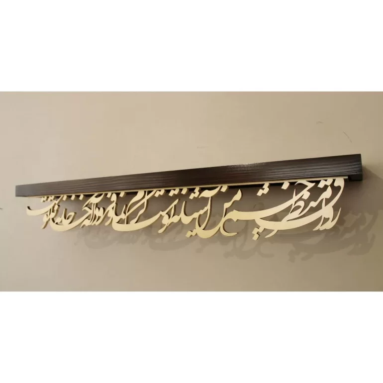 طاقچه نفیس چوبی با ابعاد 90×15 سانتی متر که متن «رواق منظر چشم من اشیانه توست، کرم نما و فرود آ که خانه خانه توست» روی آن کالیگرافی شده است. این محصول زیبا با جنس بدنه چوب روسی و جنس نوشته MDF، برای استفاده در فضای اتاق، پذیرایی،محل کار و... مناسب می باشد.