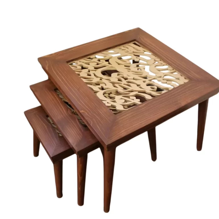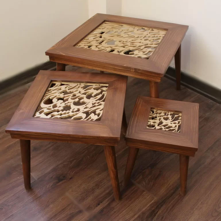 ست سه تایی میز عسلی دارای ابعاد 28×28، 42×42 و 57×57 سانتی متر بوده و عبارت های مختلفی روی آن کالیگرافی شده است. این محصولات زیبا با جنس بدنه روکش راش یا ملچ و جنس نوشته MDF، برای استفاده در فضای اتاق، پذیرایی،محل کار و... مناسب می باشد. ضخامت نوشته ها حدود 8 میلی متر است و قرار گیری شیشه روی میز آنها را کاربردی تر میکند. (نصب شیشه توسط خودتان باید انجام شود).