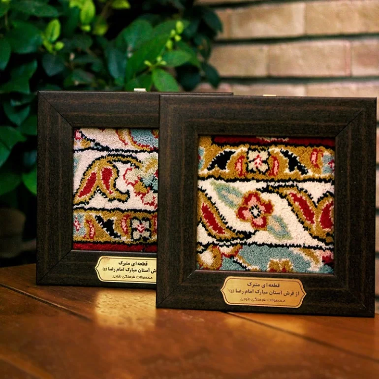 این محصول قطعه ای از فرش‌های متبرک و قدیمی حرم حضرت علی بن موسی الرضا علیه السلام می‌باشد. جنس قاب این محصول PVC بوده و ابعاد دور تا دور قاب 15x15 سانتی متر می‌باشد.