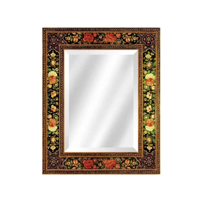 آینه طرح گل و مرغ در ابعاد 36*29 سانتی‌متر و از جنس چوب MDF تولید می‌شود. نوع چاپ قاب این آینه دکوپاژ می‌باشد.