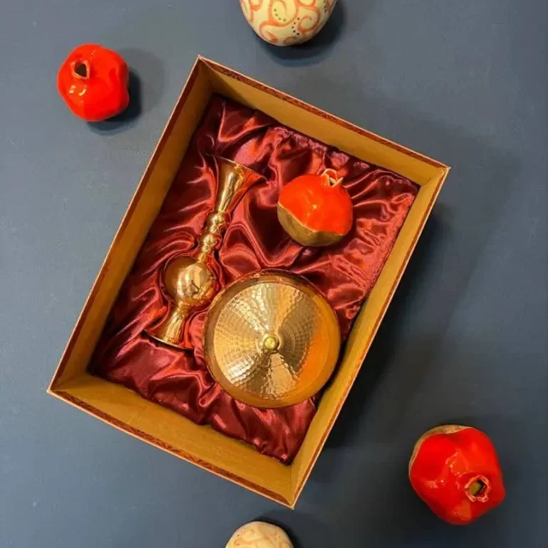 پک یلدای شماره 1401 کد 7، این پک شامل گلدان مسی، انار سرخ سرامیکی و جعبه خاتم کاری کادویی نفیس میباشد.