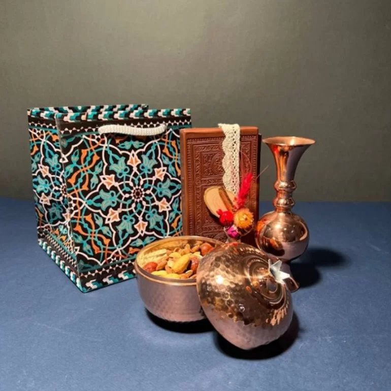 پک یلدا، این پک شامل ظروف مسی، دیوان حافظ، آجیل و ساک دستی نفیس میباشد.