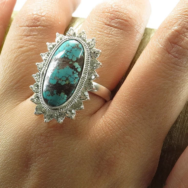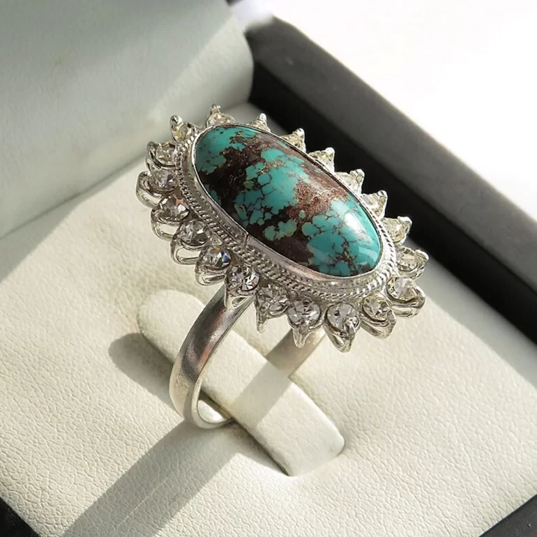 انگشتر زنانه فیروزه نیشابوری خوش طرح، رکاب این انگشتر از نقره 925 عیار با وزن تقریبا 8 گرم است. سفارشات هر انگشتر بلافاصله به دست اساتید خبره و زبردست در زمان کوتاهی، درست مطابق سایزی که شما ثبت می‌کنید ساخته شده و آماده ارسال می‌شوند. بدنه این انگشترها دارای ضخامت و کیفیت بالایی می‌باشند، به طوری که ترکیب نقره های اصیل با سنگ نگینشان، زیبایی خیره کننده‌ای را خواهند ساخت. محصولات انگشتر ربیع از قبل آماده نشده اند و همه آنها مطابق با سایز دست شما که از طریق منو انتخاب می‌کنید، ساخته خواهند شد.