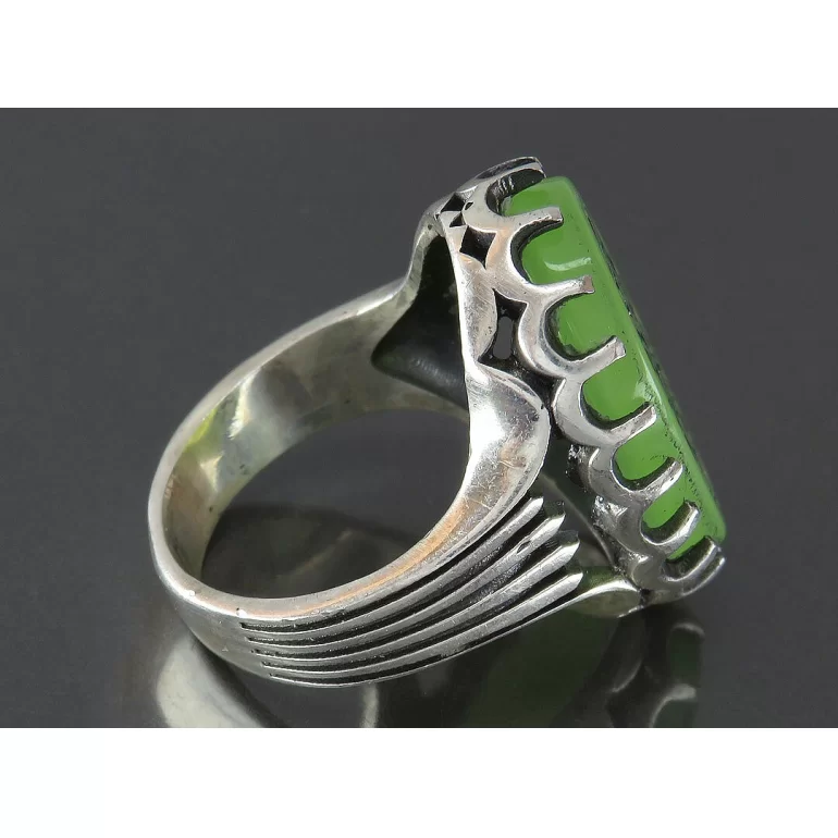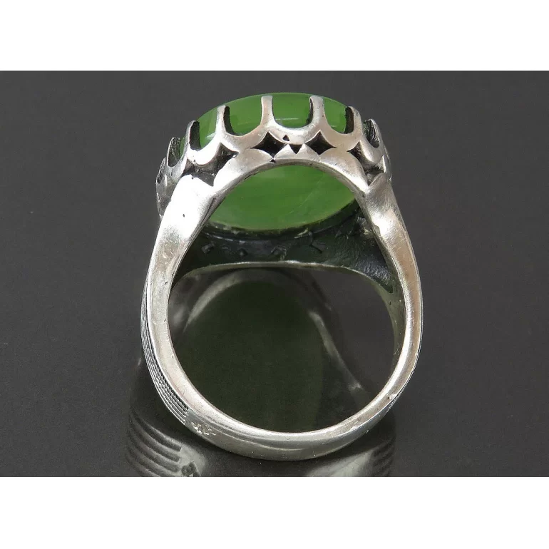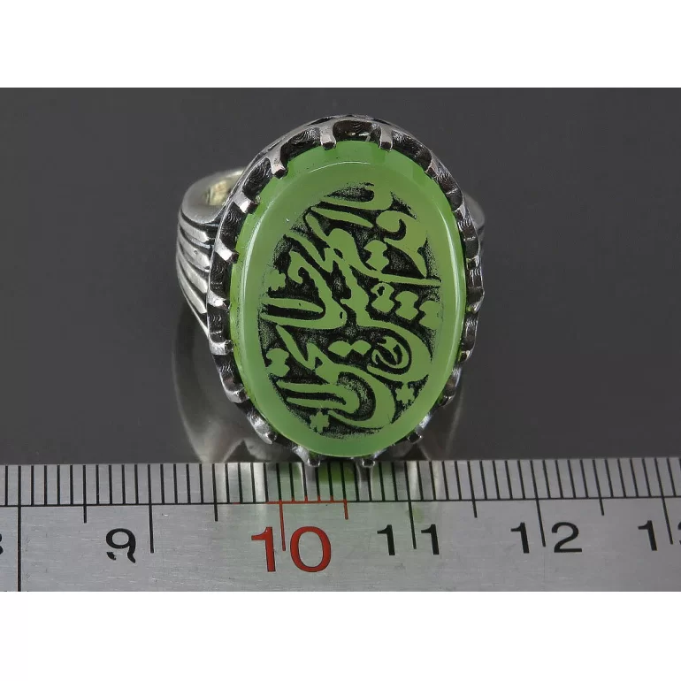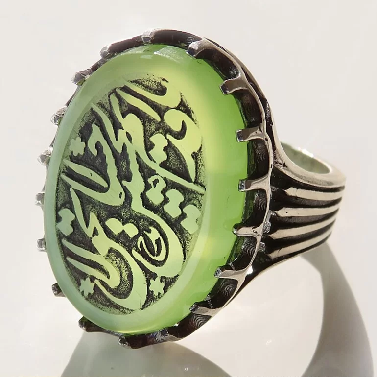 رکاب این انگشتر مردانه از نقره 925 عیار بوده و نگین آن از جنس عقیق سبز با حکاکی یا قدیم الاحسان بحق حسین می باشد. وزن این انگشتر نفیس تقریبا 15.5 گرم است و به صورت حرفه ای به دست استادکار خبره و باتجربه ساخته می شود.