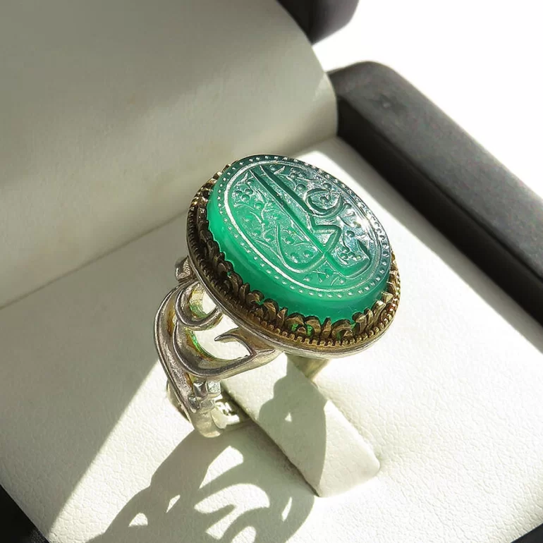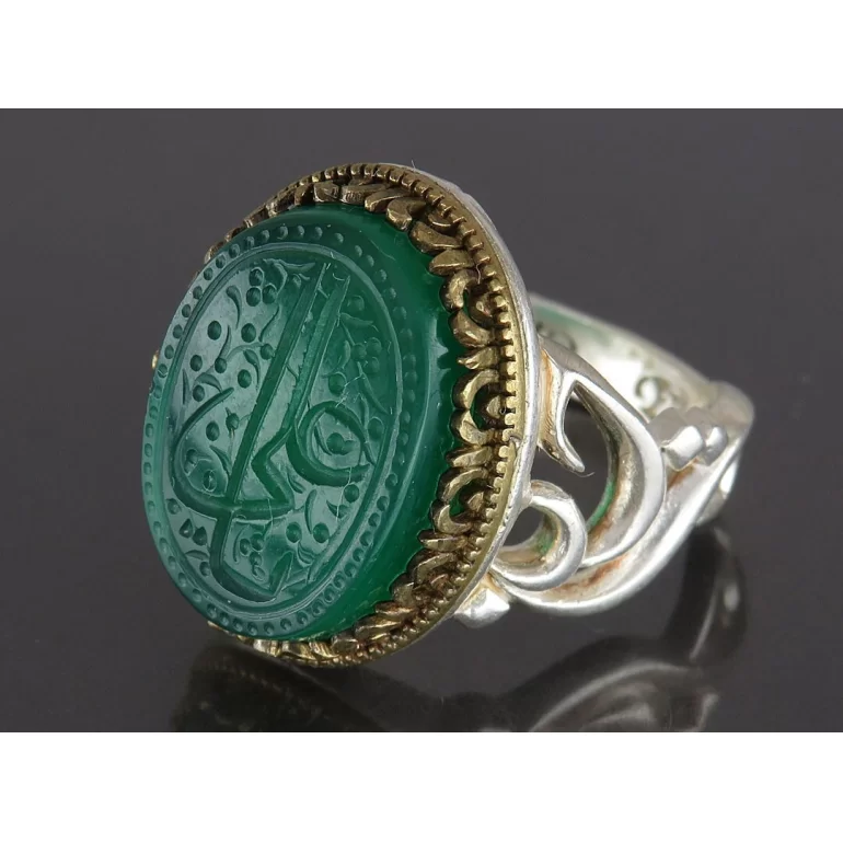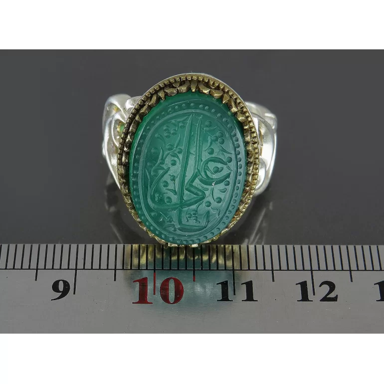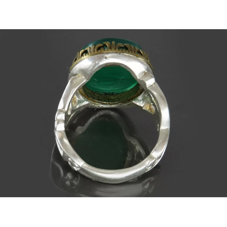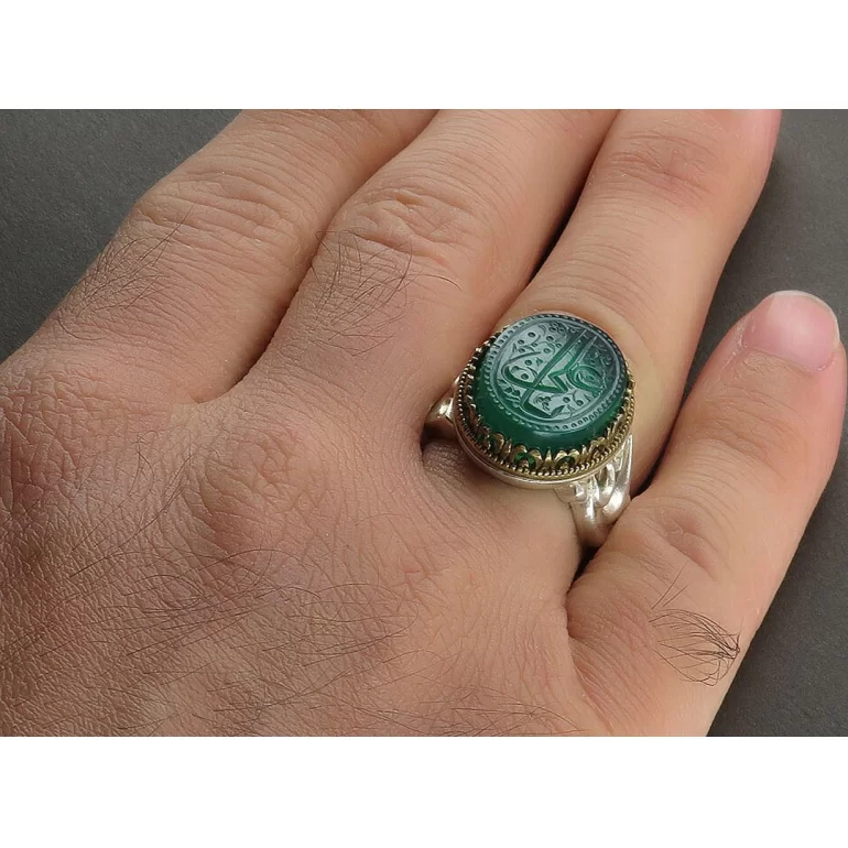 رکاب این انگشتر مردانه از نقره 925 عیار بوده و نگین آن از جنس عقیق سبز با حکاکی یا علی می باشد. وزن این انگشتر نفیس تقریبا 12.5 گرم است و به صورت حرفه ای به دست استادکار خبره و باتجربه ساخته می شود.