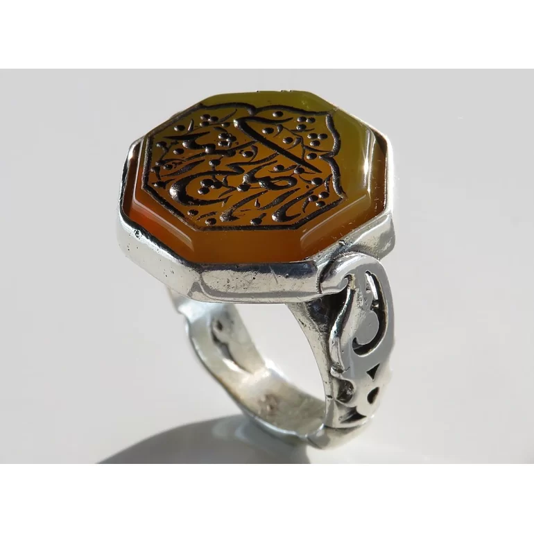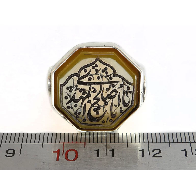 رکاب این انگشتر مردانه از نقره 925 عیار بوده و نگین آن از جنس عقیق زرد با حکاکی یا ابا صالح المهدی می باشد. وزن این انگشتر نفیس تقریبا 17 گرم است و به صورت حرفه ای به دست استادکار خبره و باتجربه ساخته می شود.
