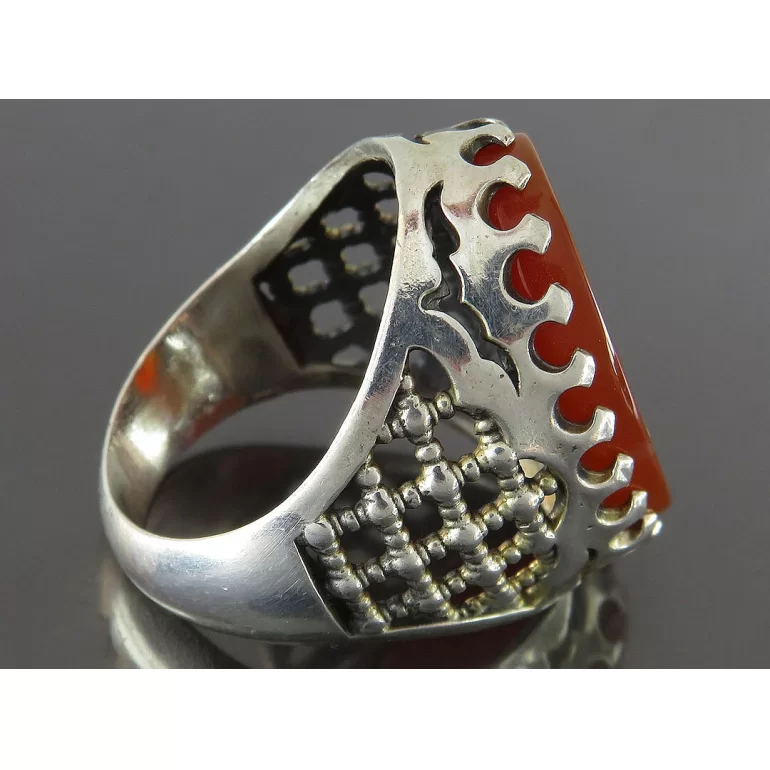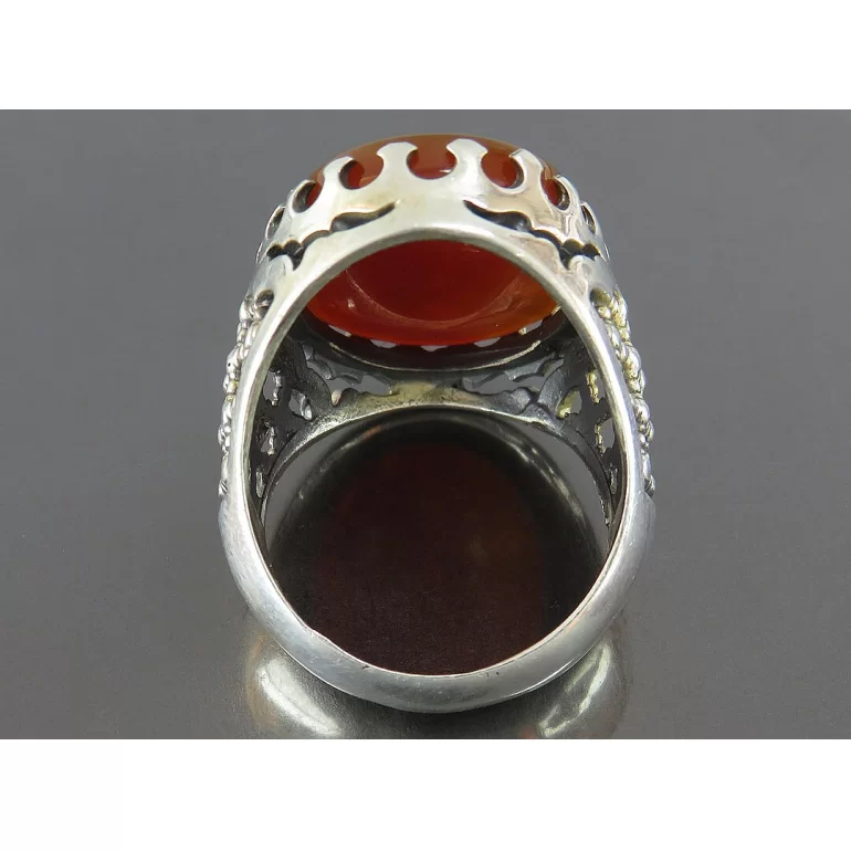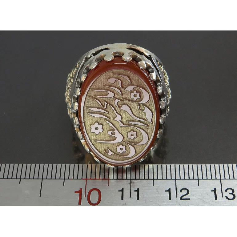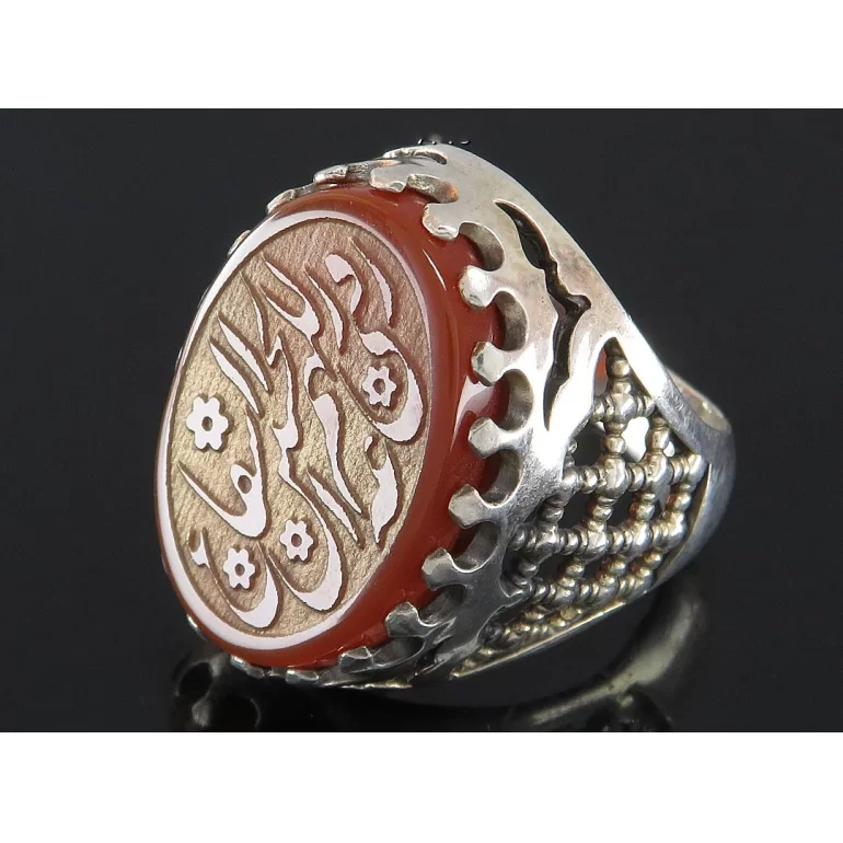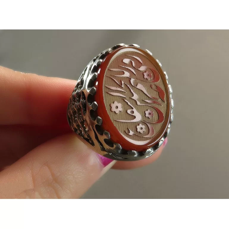 رکاب این انگشتر مردانه از نقره 925 عیار بوده و نگین آن از جنس عقیق قهوه ای با حکاکی اللهم ارزقنی الحسین شفاعه می باشد. وزن این انگشتر نفیس تقریبا 15 گرم است و به صورت حرفه ای به دست استادکار خبره و باتجربه ساخته می شود.