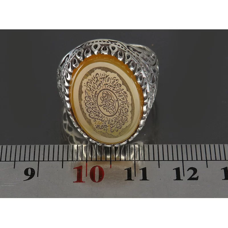 رکاب این انگشتر مردانه از نقره 925 عیار بوده و نگین آن از جنس عقیق زرد با حکاکی آیت الکرسی می باشد. وزن این انگشتر نفیس تقریبا 11.5 گرم است و به صورت حرفه ای به دست استادکار خبره و باتجربه ساخته می شود.
