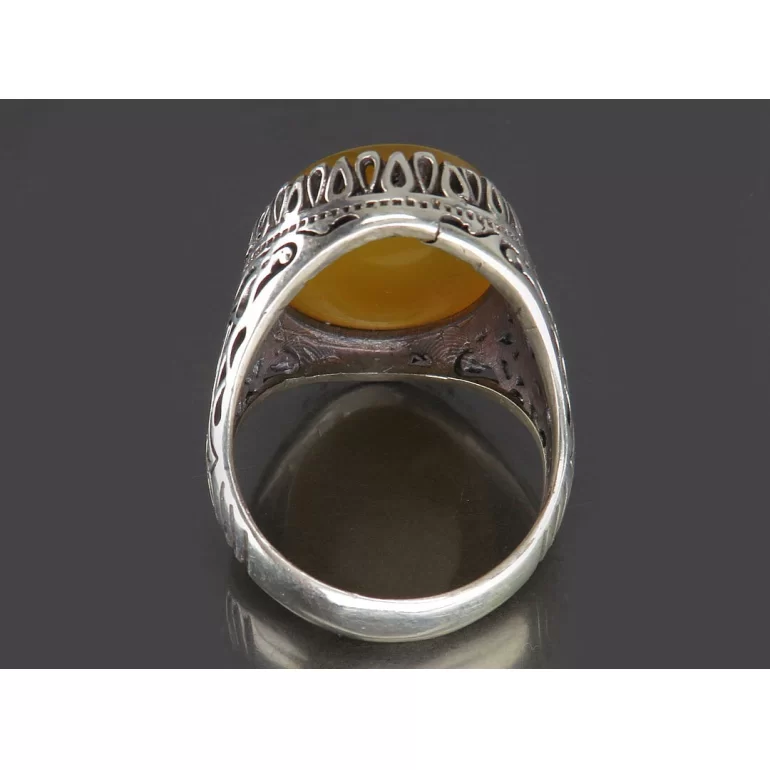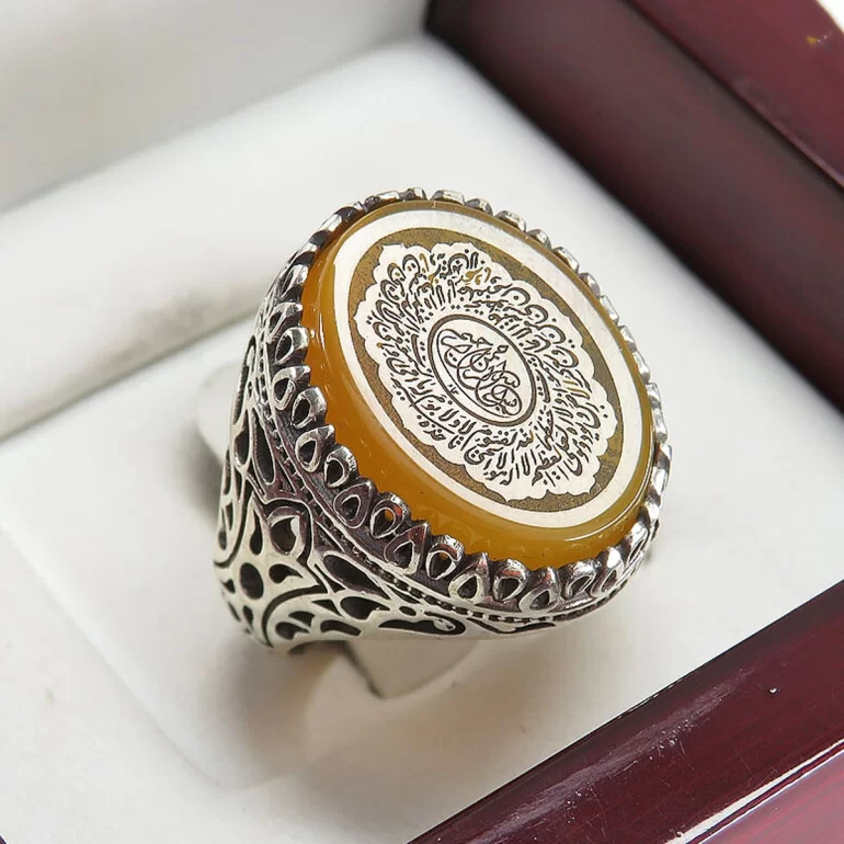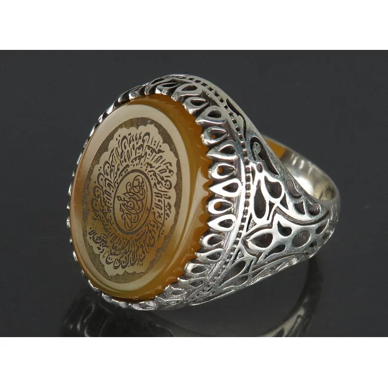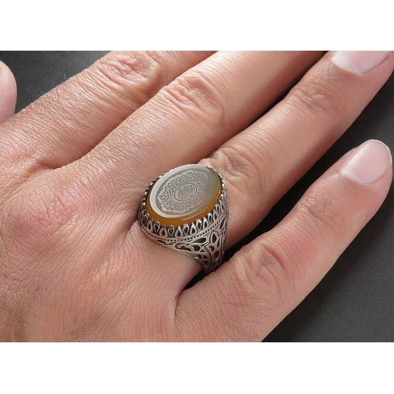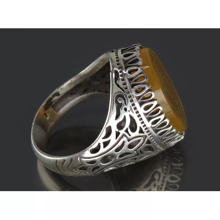 رکاب این انگشتر مردانه از نقره 925 عیار بوده و نگین آن از جنس عقیق زرد با حکاکی آیت الکرسی می باشد. وزن این انگشتر نفیس تقریبا 11.5 گرم است و به صورت حرفه ای به دست استادکار خبره و باتجربه ساخته می شود.