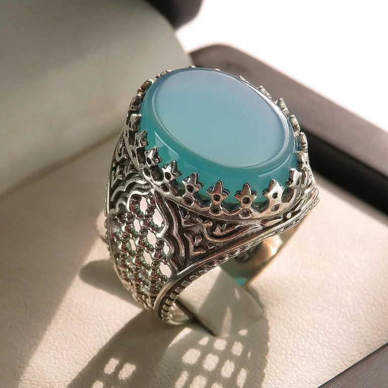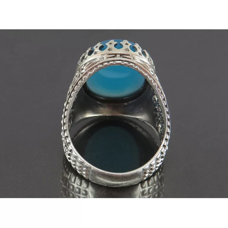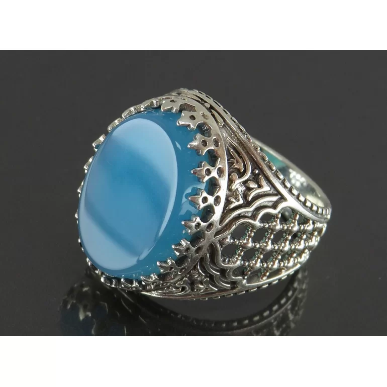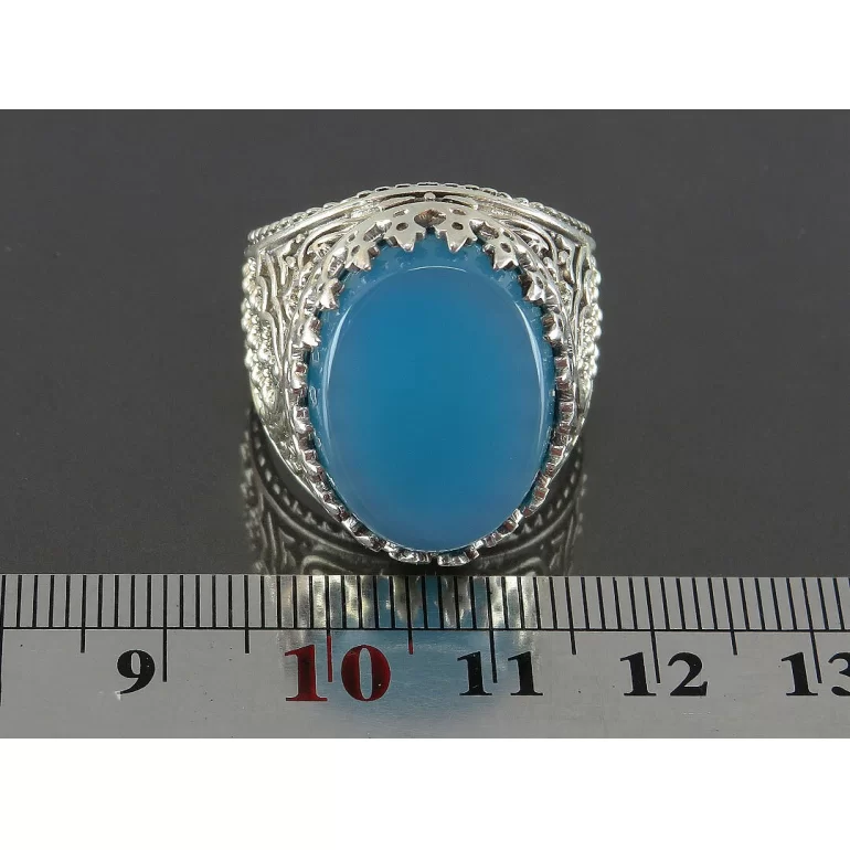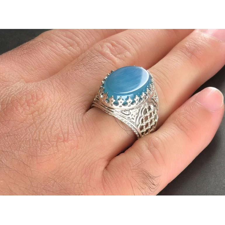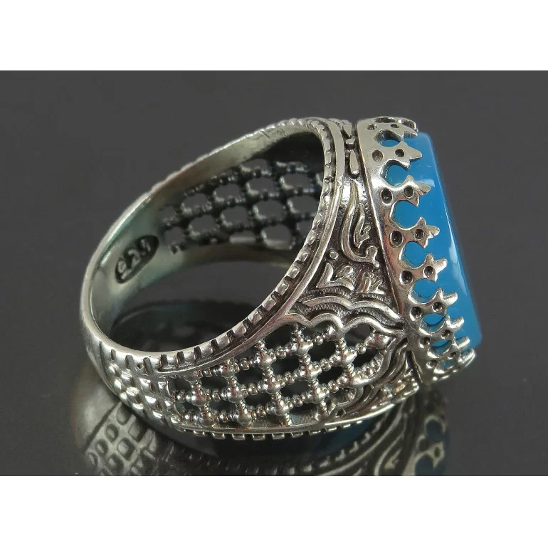 رکاب این انگشتر مردانه از نقره 925 عیار بوده و نگین آن از جنس عقیق آبی می باشد. وزن این انگشتر نفیس تقریبا 13 گرم است و به صورت حرفه ای به دست استادکار خبره و باتجربه ساخته می شود.