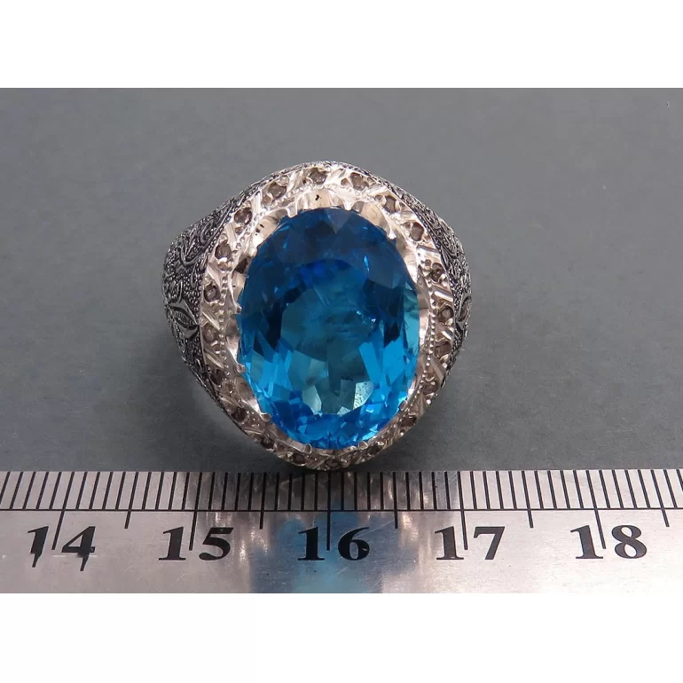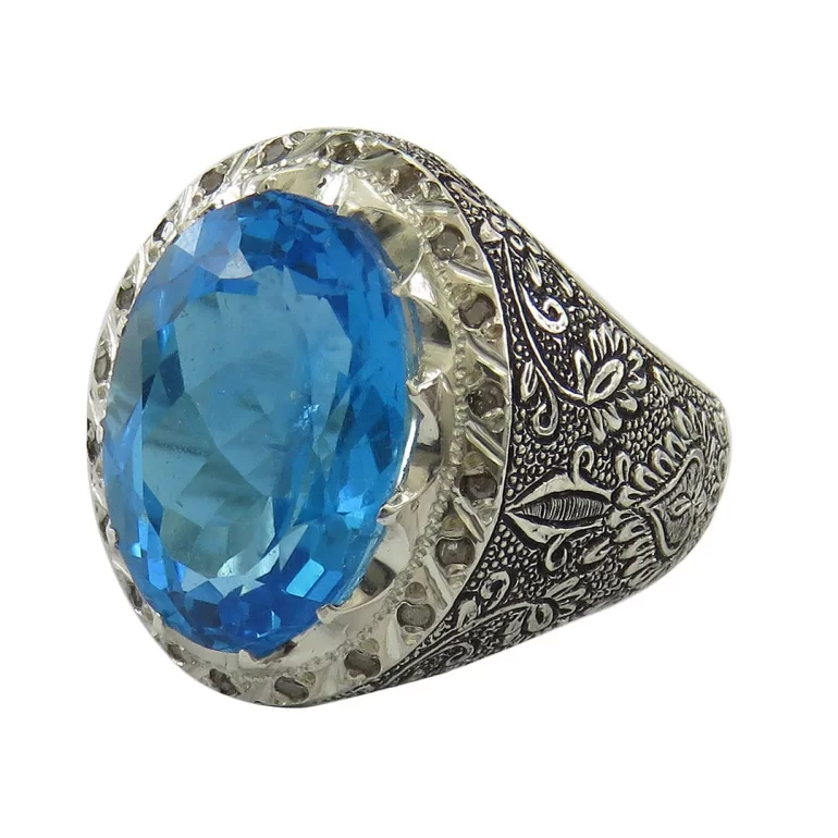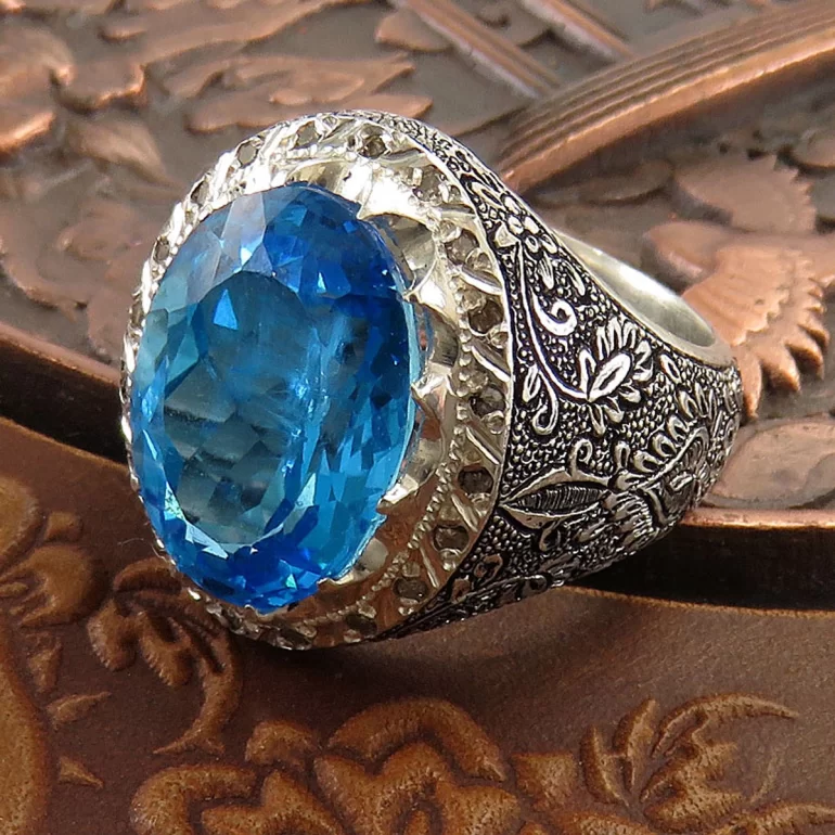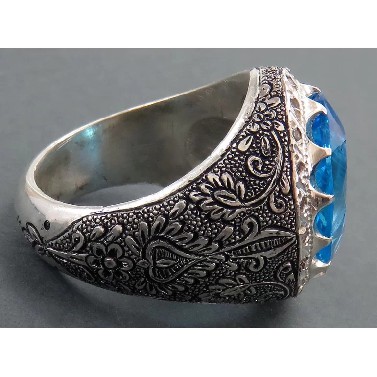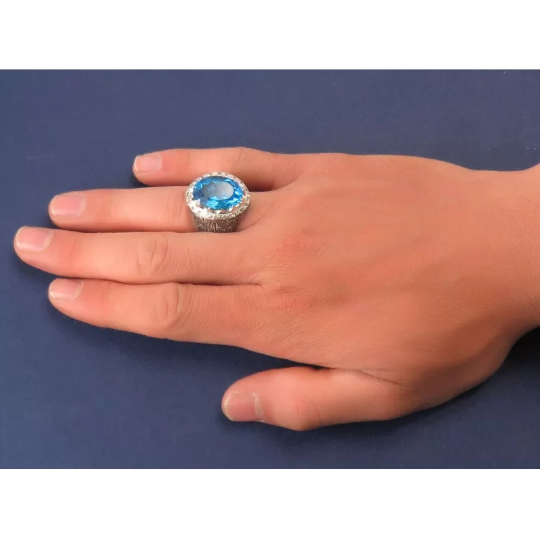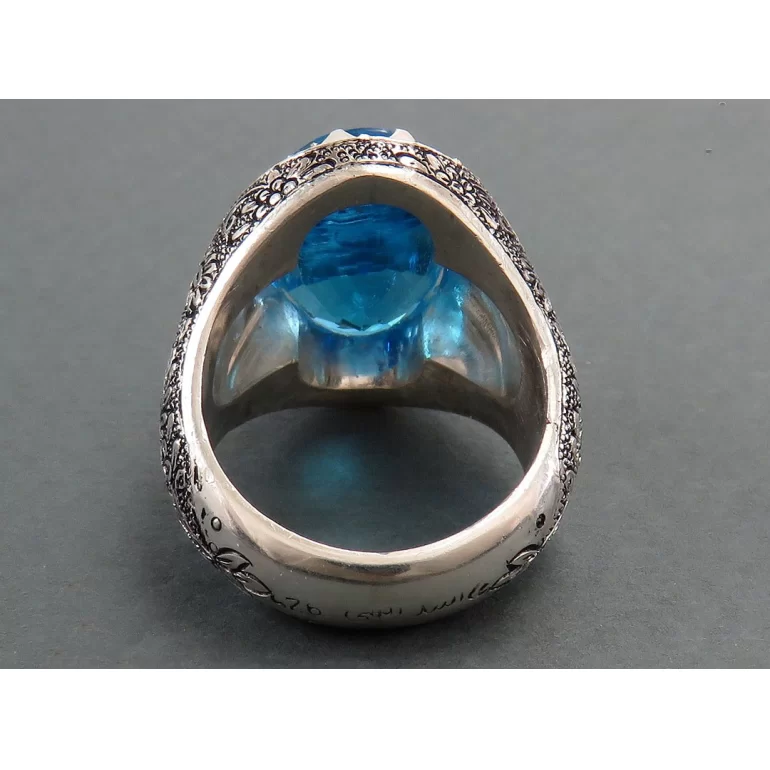 رکاب این انگشتر مردانه از نقره 925 عیار بوده و نگین آن از جنس توپاز می باشد. وزن این انگشتر نفیس تقریبا 29 گرم است و به صورت حرفه ای به دست استادکار خبره و باتجربه ساخته می شود و دارای مخرج کاری دست ساز است.