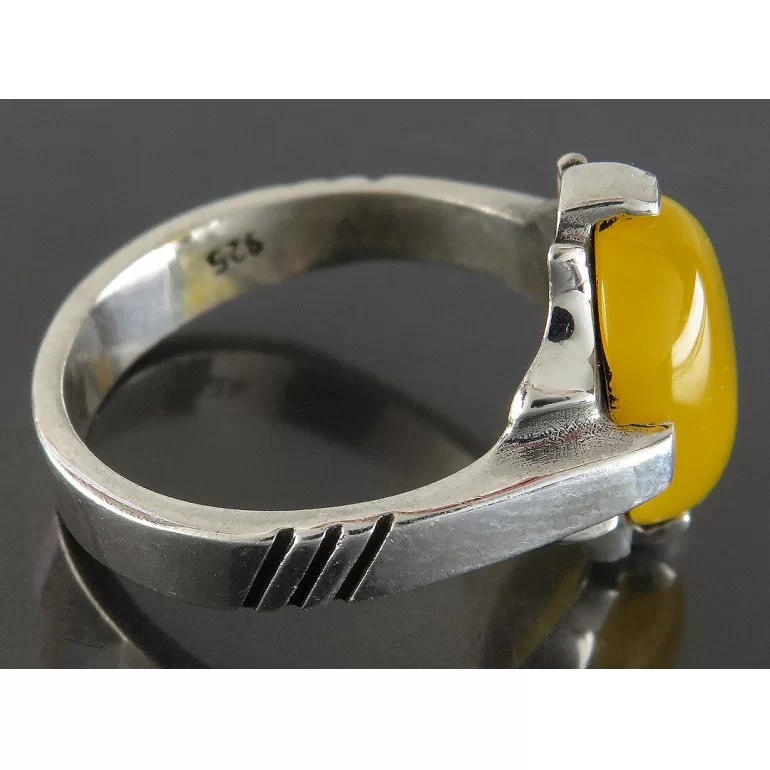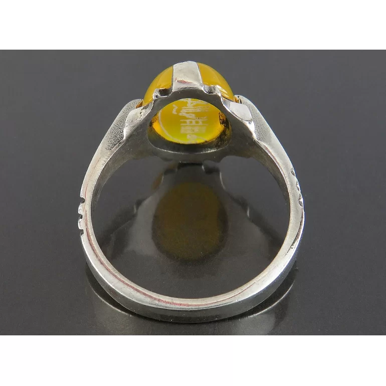 رکاب این انگشتر مردانه از نقره 925 عیار بوده و نگین آن از جنس عقیق شرف الشمس می باشد. وزن این انگشتر نفیس تقریبا 6.5 گرم است و به صورت حرفه ای به دست استادکار خبره و باتجربه ساخته می شود.
