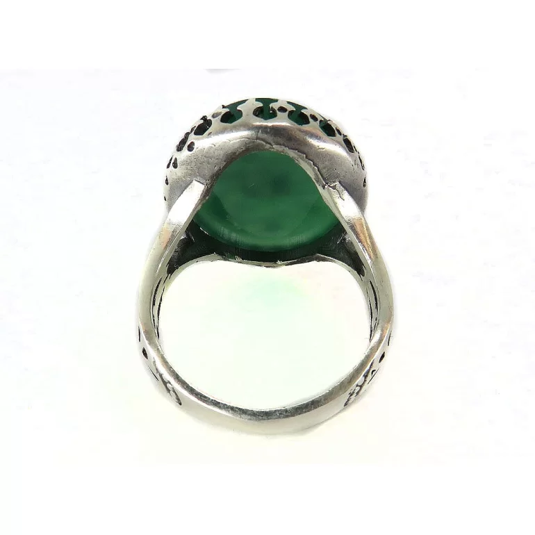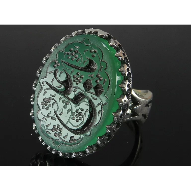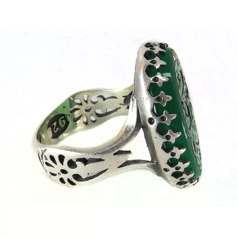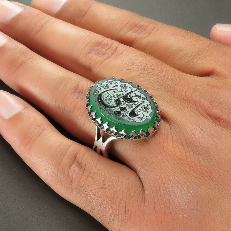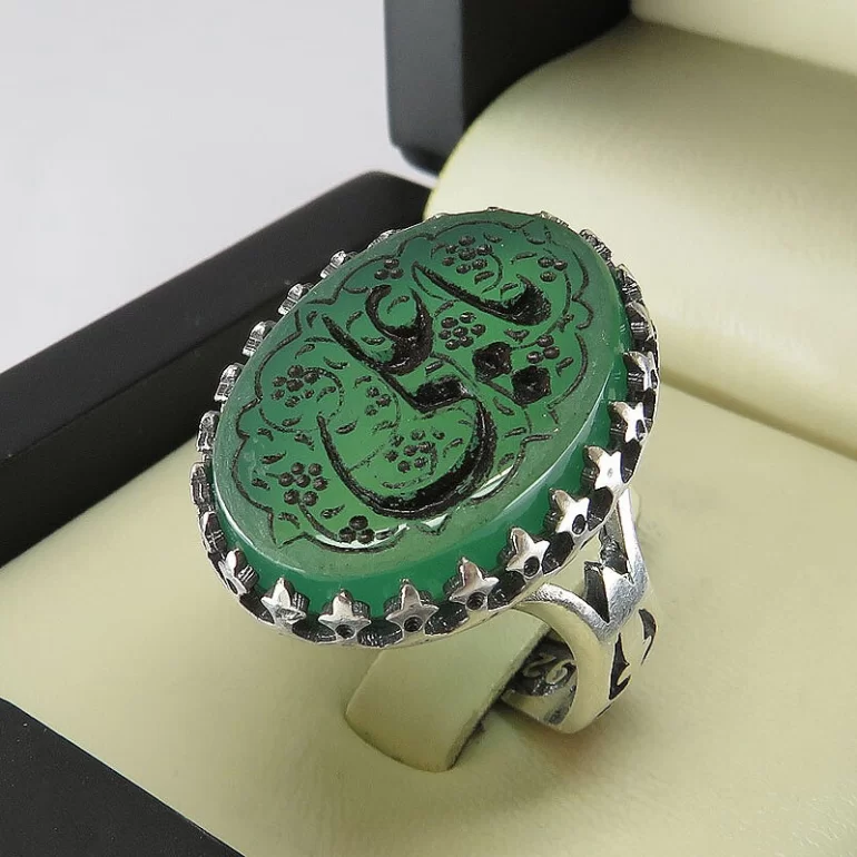رکاب این انگشتر مردانه از نقره 925 عیار بوده و نگین آن از جنس عقیق سبز با حکاکی یا علی می باشد. وزن این انگشتر نفیس تقریبا 12.5 گرم است و به صورت حرفه ای به دست استادکار خبره و باتجربه ساخته می شود.