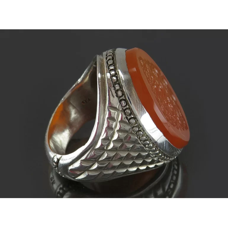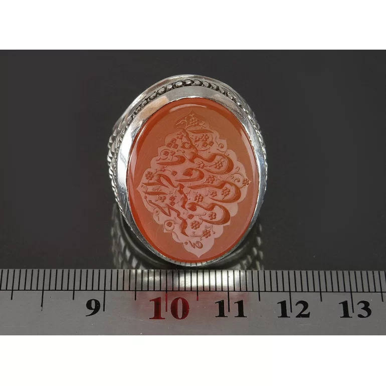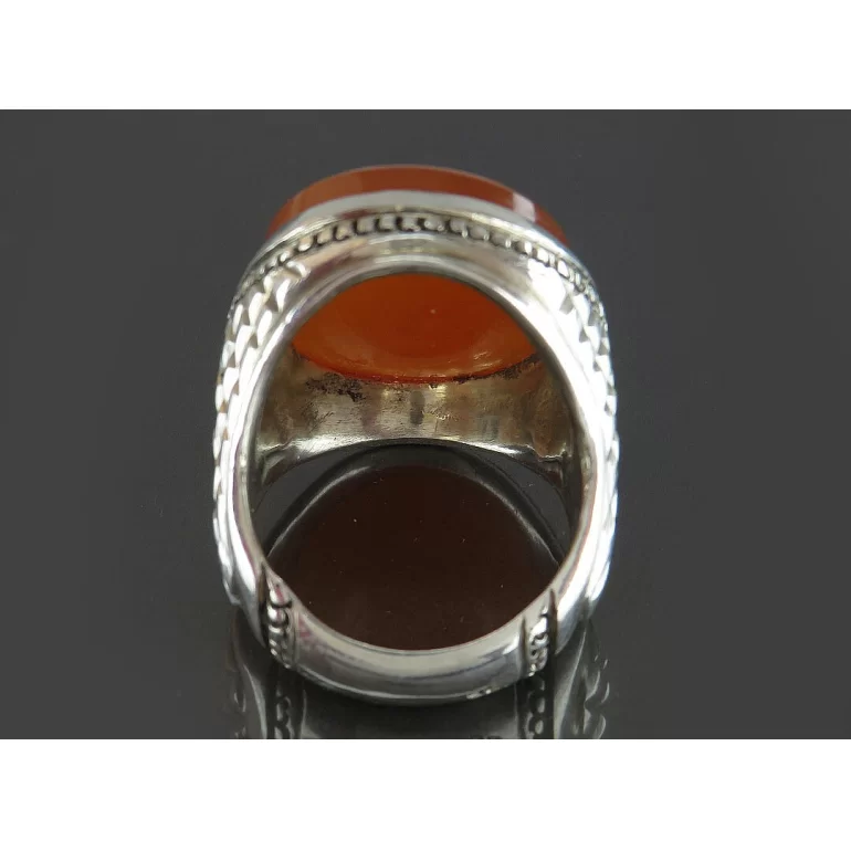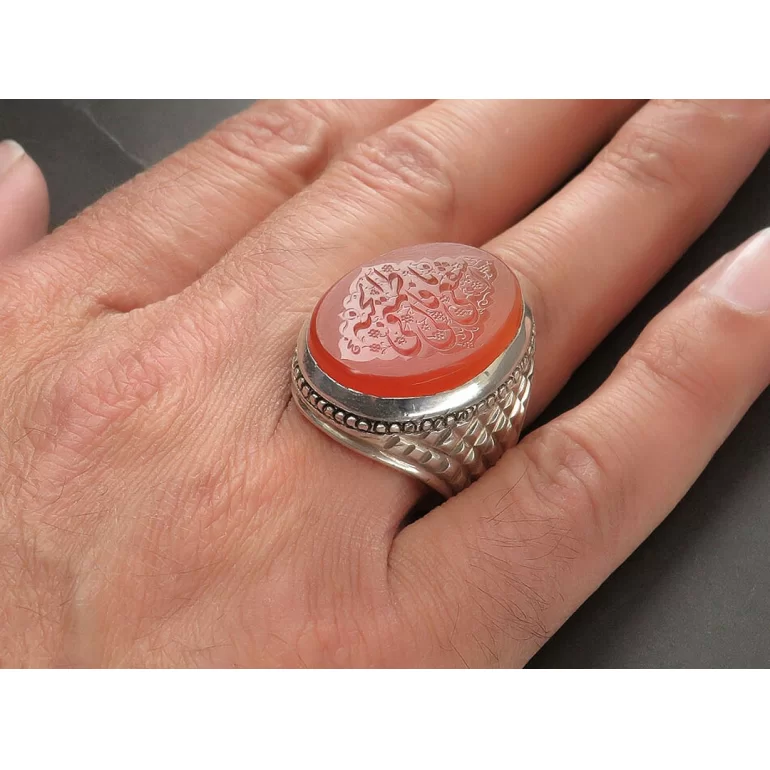 رکاب این انگشتر مردانه از نقره 925 عیار بوده و نگین آن از جنس عقیق نارنجی دست ساز با حکاکی یا فاطمه اشفعی لی فی الجنه می باشد. وزن این انگشتر نفیس تقریبا 30 گرم است و به صورت حرفه ای به دست استادکار خبره و باتجربه ساخته می شود.