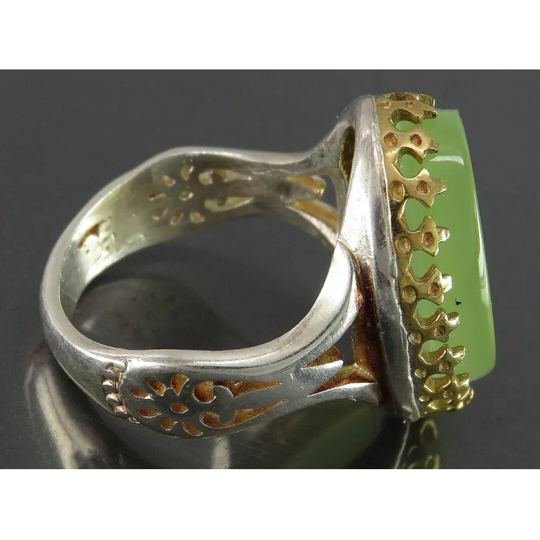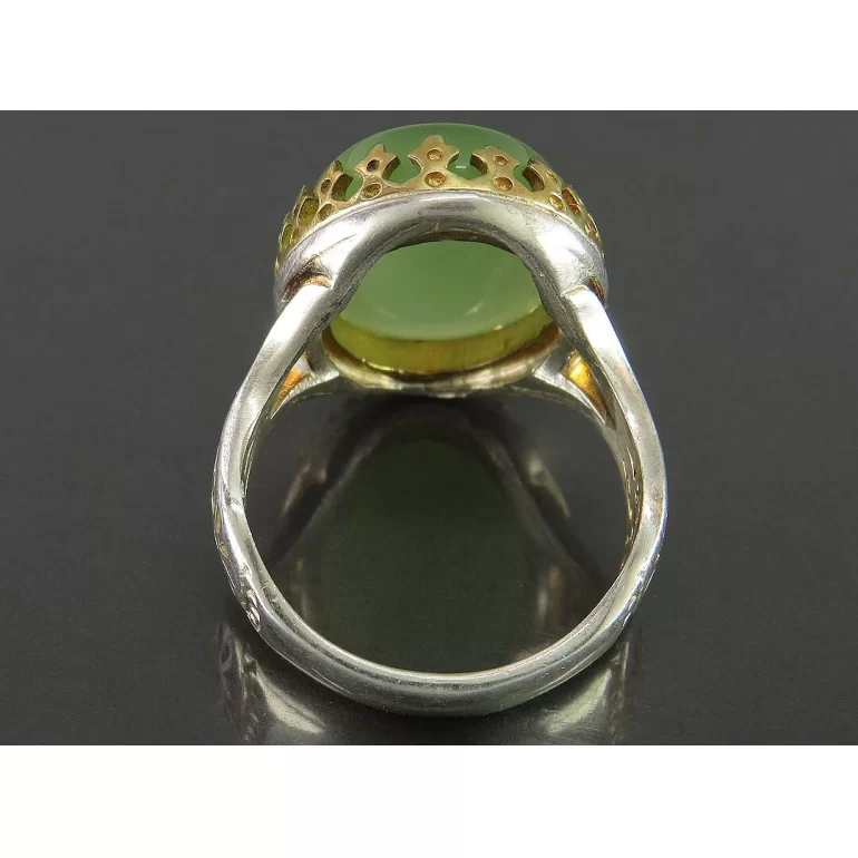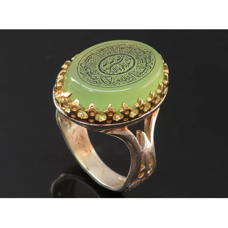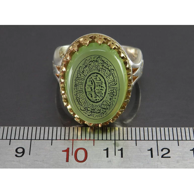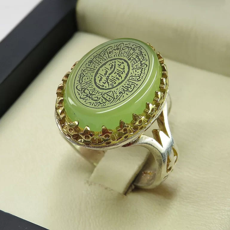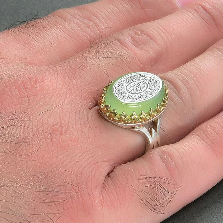 رکاب این انگشتر مردانه از نقره 925 عیار بوده و نگین آن از جنس عقیق سبز با حکاکی ماشاالله لا قوه الا بالله استغفرالله می باشد. وزن این انگشتر نفیس تقریبا 11.5 گرم است و به صورت حرفه ای به دست استادکار خبره و باتجربه ساخته می شود. رکاب انگشتر تاج برنجی می باشد.