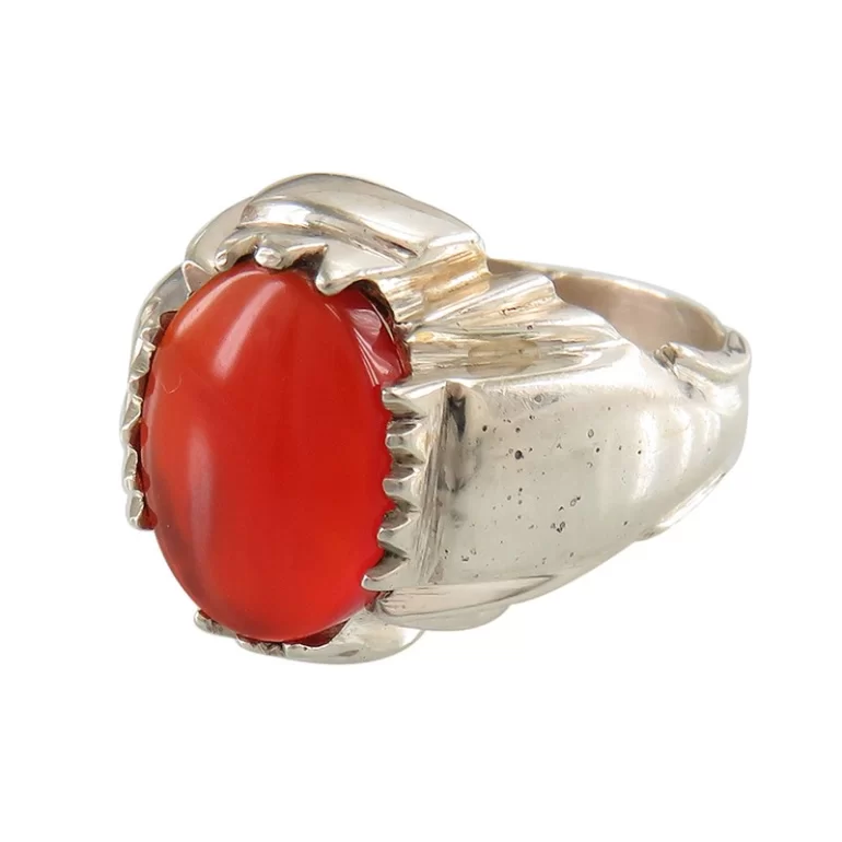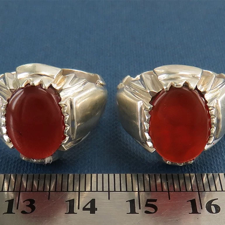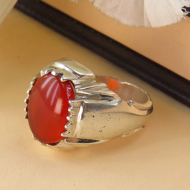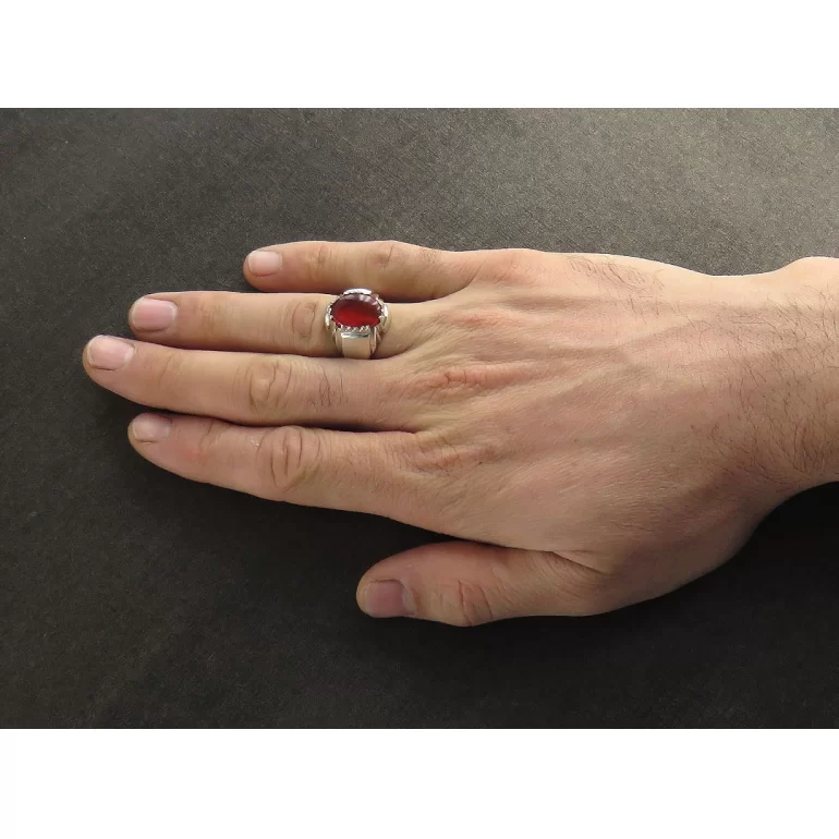 رکاب این انگشتر مردانه از نقره 925 عیار بوده و نگین آن از جنس عقیق یمن قرمز دست ساز می باشد. وزن این انگشتر نفیس تقریبا 11.5 گرم است و به صورت حرفه ای به دست استادکار خبره و باتجربه ساخته می شود.