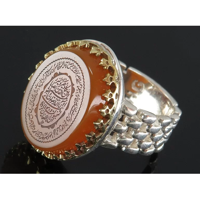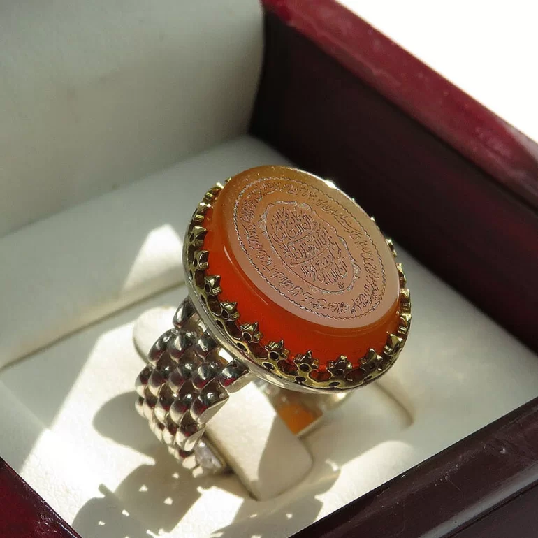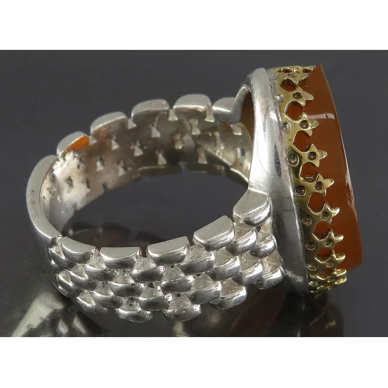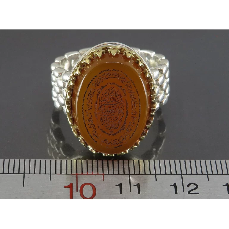 رکاب این انگشتر مردانه از نقره 925 عیار بوده و نگین آن از جنس عقیق قهوه ای با حکاکی وان یکاد می باشد. وزن این انگشتر نفیس تقریبا 13 گرم است و به صورت حرفه ای به دست استادکار خبره و باتجربه ساخته می شود.