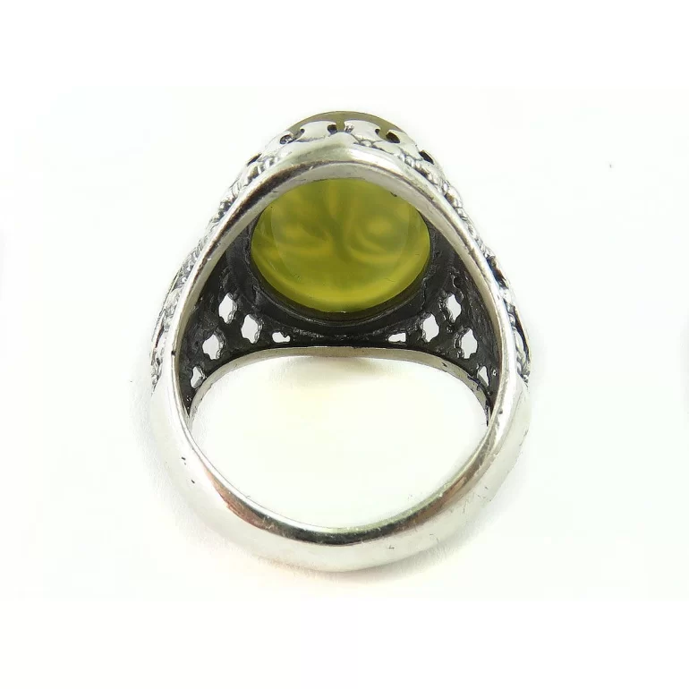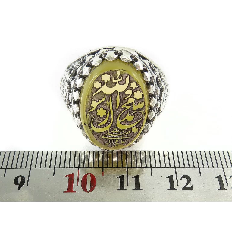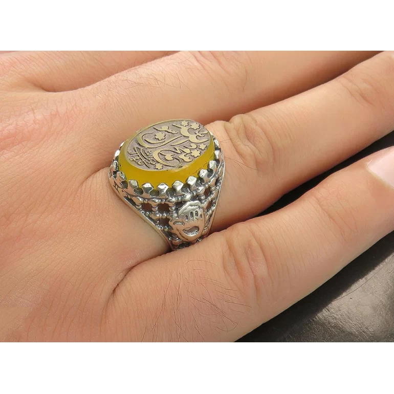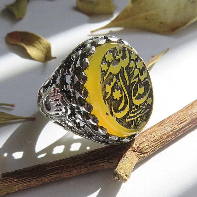 رکاب این انگشتر مردانه از نقره 925 عیار بوده و نگین آن از جنس عقیق زرد با حکاکی محمد رسول الله صل الله علیه و اله می باشد. وزن این انگشتر نفیس تقریبا 13 گرم است و به صورت حرفه ای به دست استادکار خبره و باتجربه ساخته می شود.