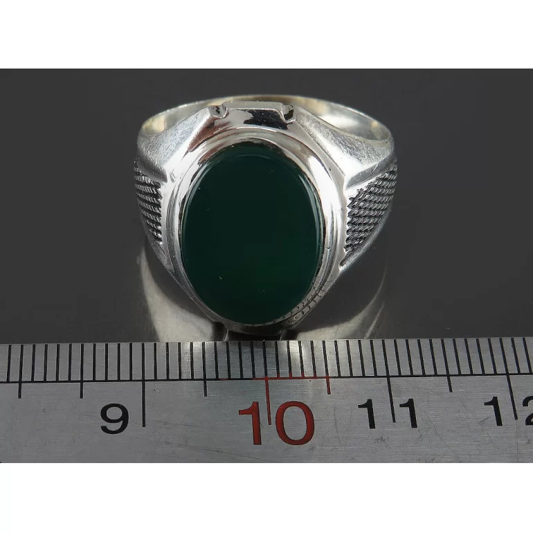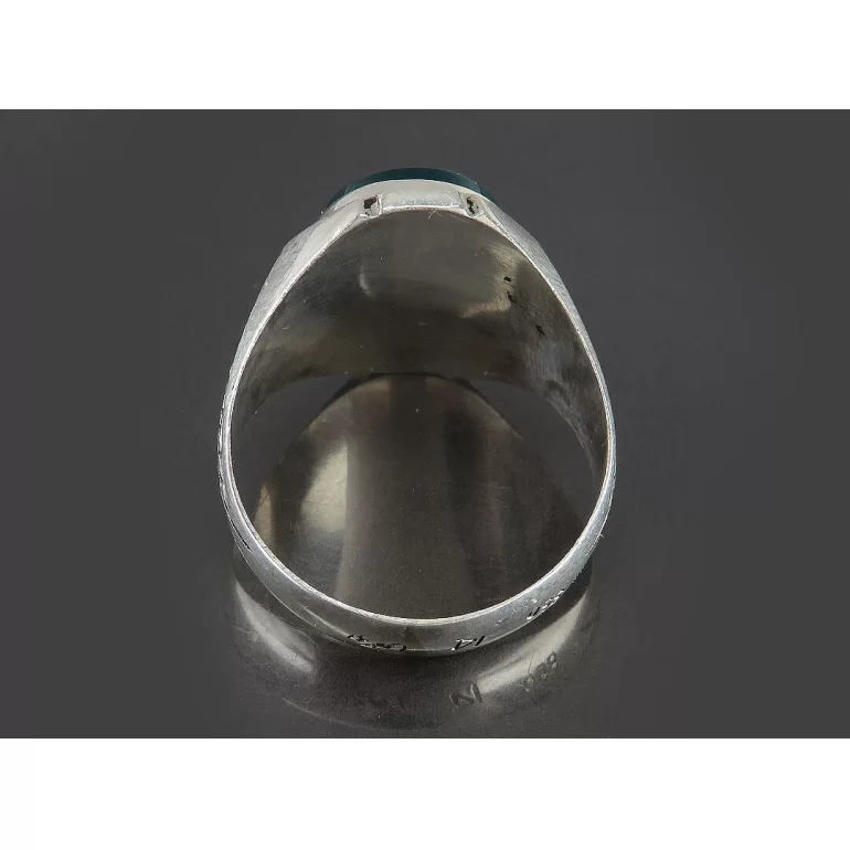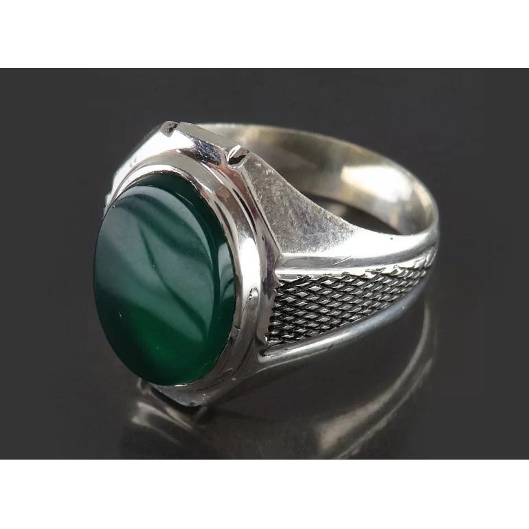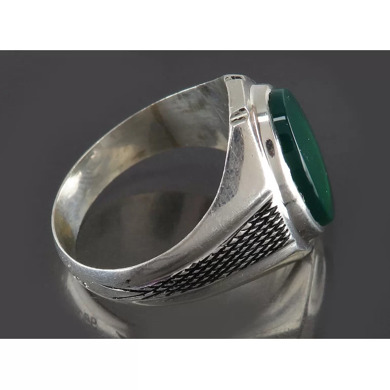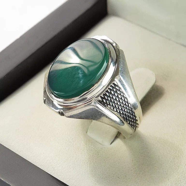 رکاب این انگشتر مردانه از نقره 925 عیار بوده و نگین آن از جنس عقیق سبز چهارده معصوم می باشد. وزن این انگشتر نفیس تقریبا 8 گرم است و به صورت حرفه ای به دست استادکار خبره و باتجربه ساخته می شود.