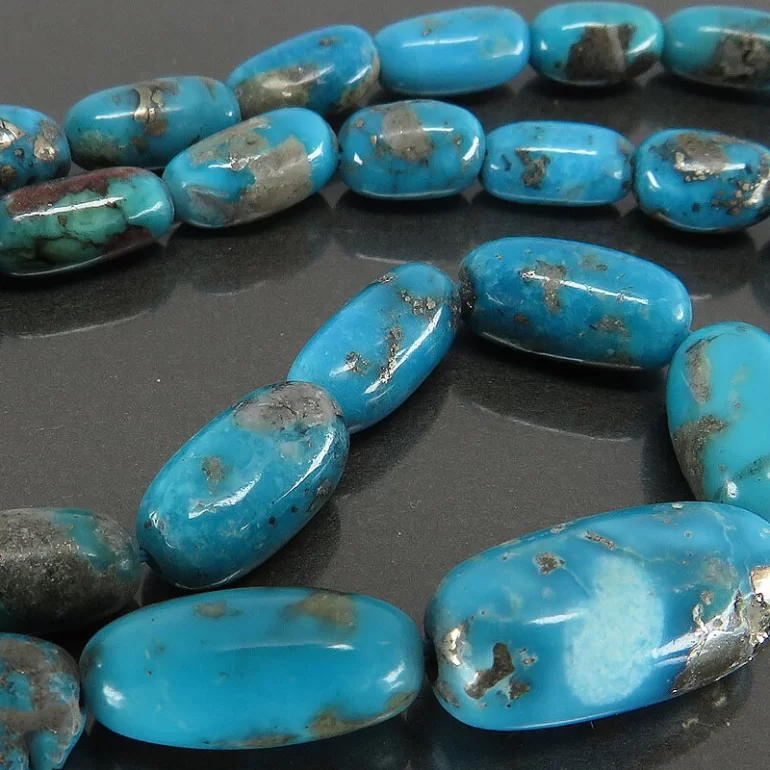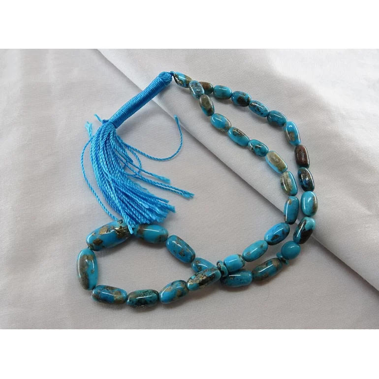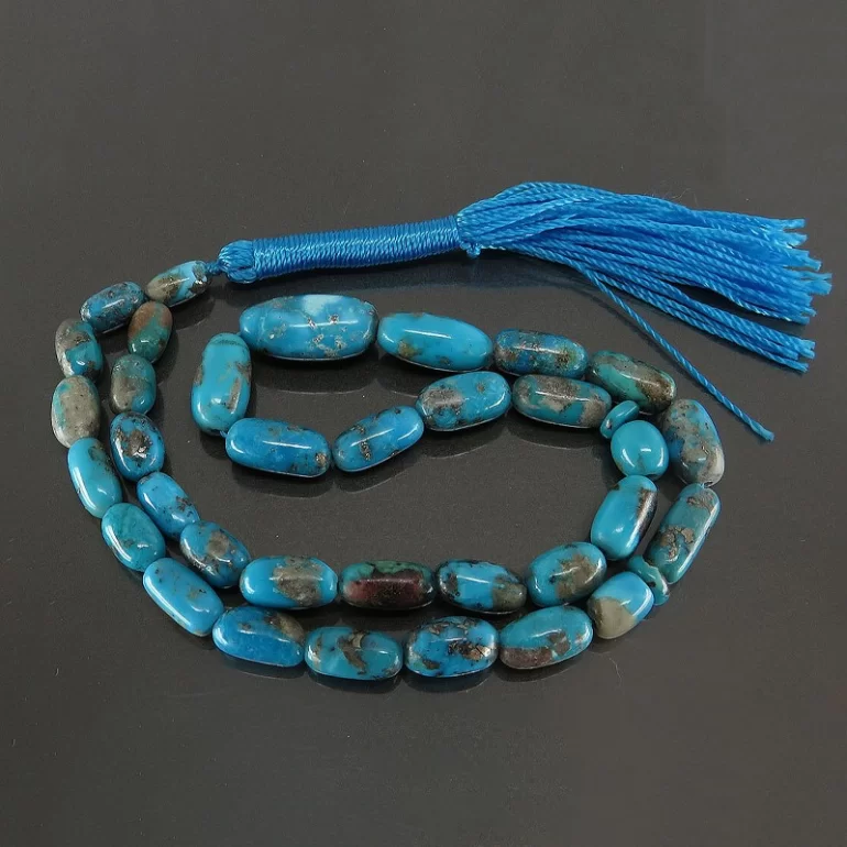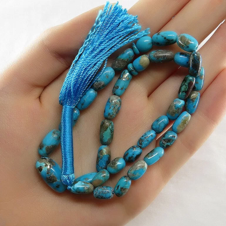 تسبیح فیروزه کرمانی 33 دانه رنگ شده با طراحی بسیار زیبا و فوق العاده که هر سلیقه ای را مجذوب خود میکند. تعداد مهره های این تسبیح 33 دانه است. طول تقریبی تسبیح (قسمت دانهها و شیخک) 17 سانتیمتر بوده و وزن آن تقریبا 19 گرم میباشد.