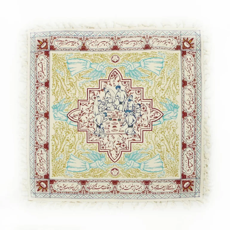 این سفره بر اساس سبک سنتی مردم ایران الگو گرفته شده است و داخل آن از اشعار عالی استفاده شده است. دور تا دور این سفره از منگوله های نخی تشکیل شده است و چاپ آن با دوام و مرغوب می‌باشد و در اثر شستشو از بین نمی‌رود.
