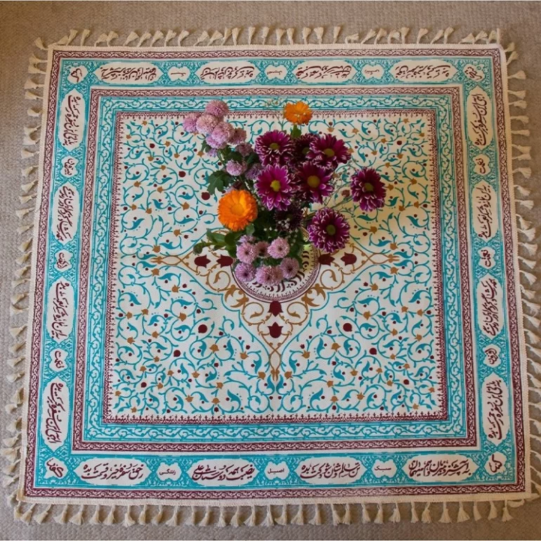این سفره بر اساس سبک سنتی مردم ایران الگو گرفته شده است و داخل آن از اشعار عالی استفاده شده است. دور تا دور این سفره از منگوله های نخی تشکیل شده است و چاپ آن با دوام و مرغوب می‌باشد و در اثر شستشو از بین نمی‌رود.