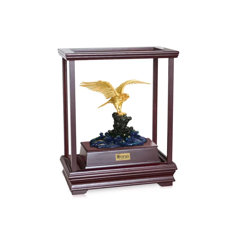تندیس ورق طلا 24 عیار دارای شناسنامه اصالت کالا و گارانتی 18 ماهه طرح عقاب، این محصول از جنس قاب چوبی ساخته و تولید شده است که در ابعاد 34*29 می‌باشد.