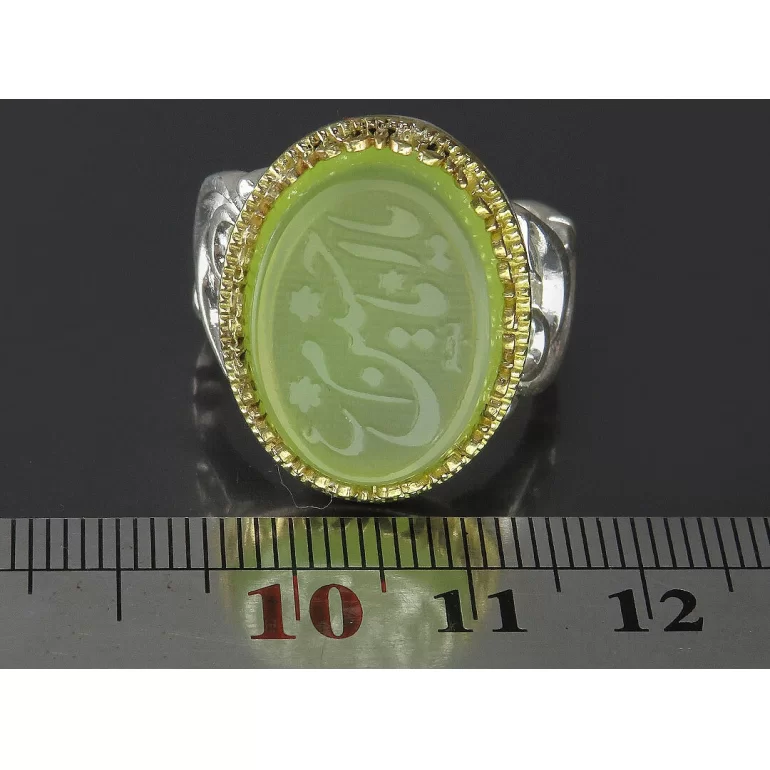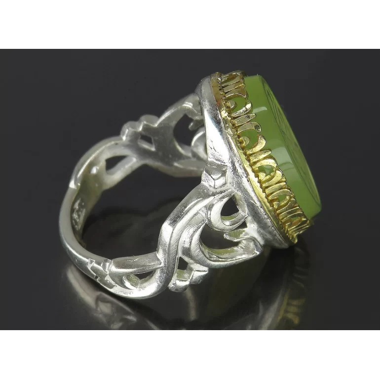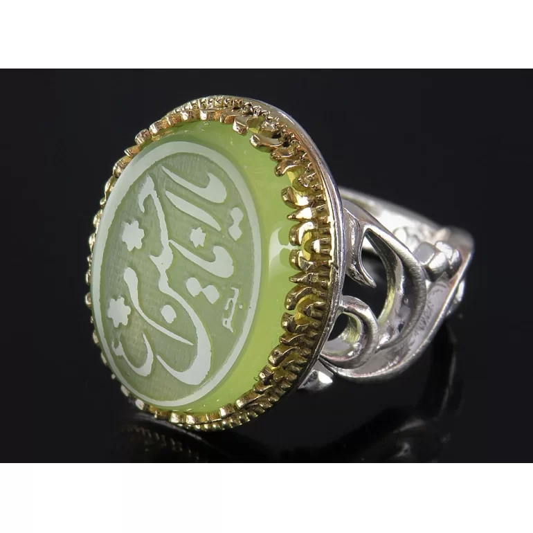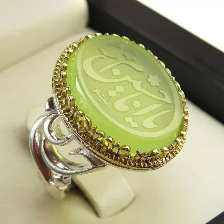 رکاب این انگشتر مردانه از نقره 925 عیار بوده و نگین آن از جنس عقیق سبز با حکاکی یا امام حسین (ع) می باشد. وزن این انگشتر نفیس تقریبا 12.5 گرم است و به صورت حرفه ای به دست استادکار خبره و باتجربه ساخته می شود