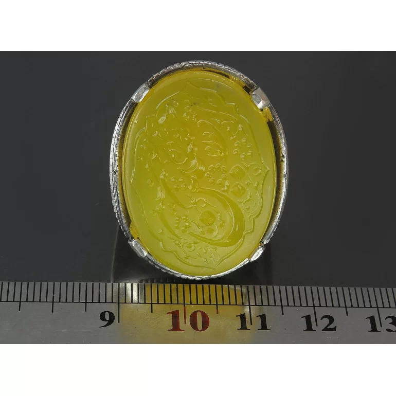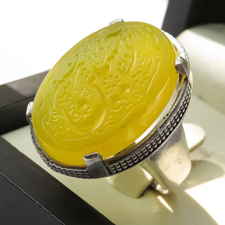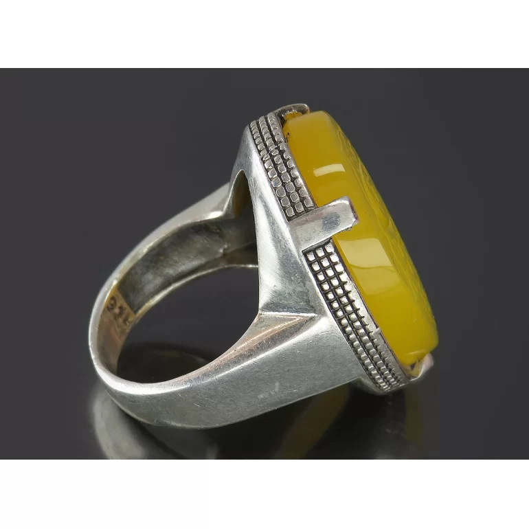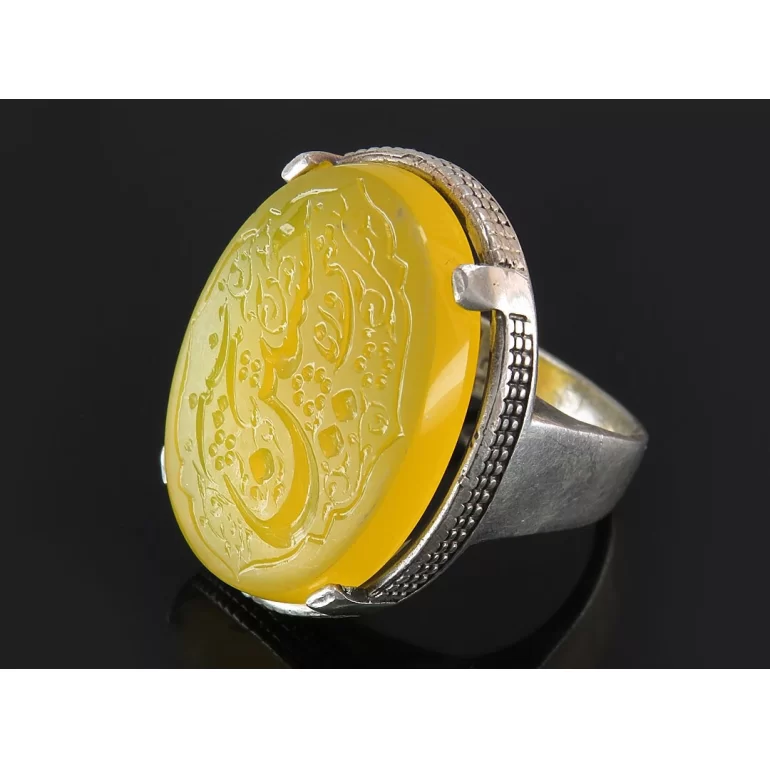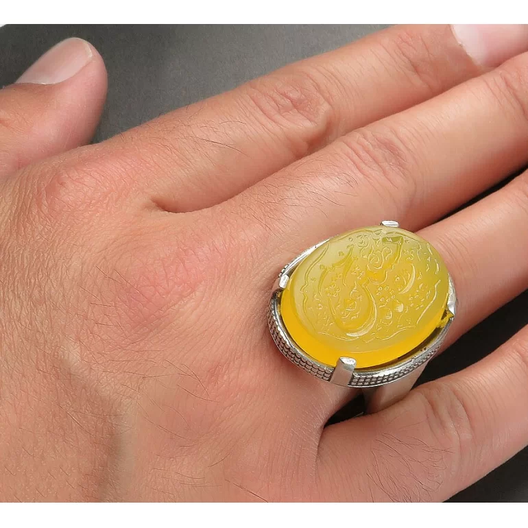 رکاب این انگشتر مردانه از نقره 925 عیار بوده و نگین آن از جنس عقیق زرد با حکاکی حسین منی و انا من حسین می باشد. وزن این انگشتر نفیس تقریبا 26 گرم است و به صورت حرفه ای به دست استادکار خبره و باتجربه ساخته می شود.