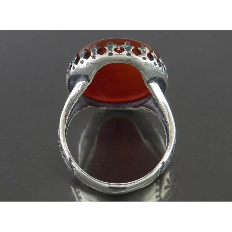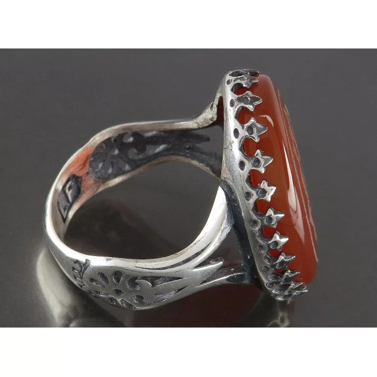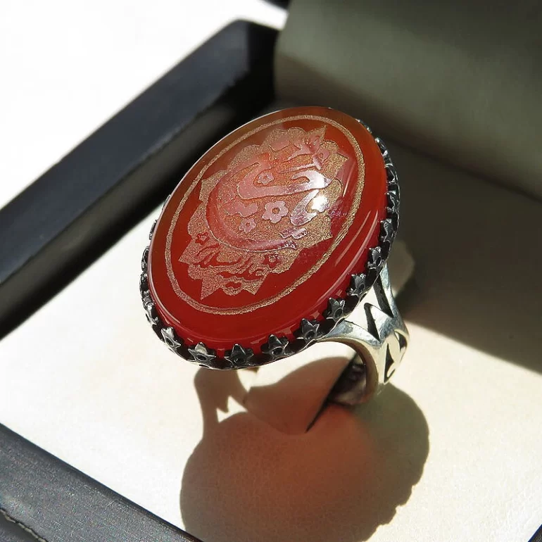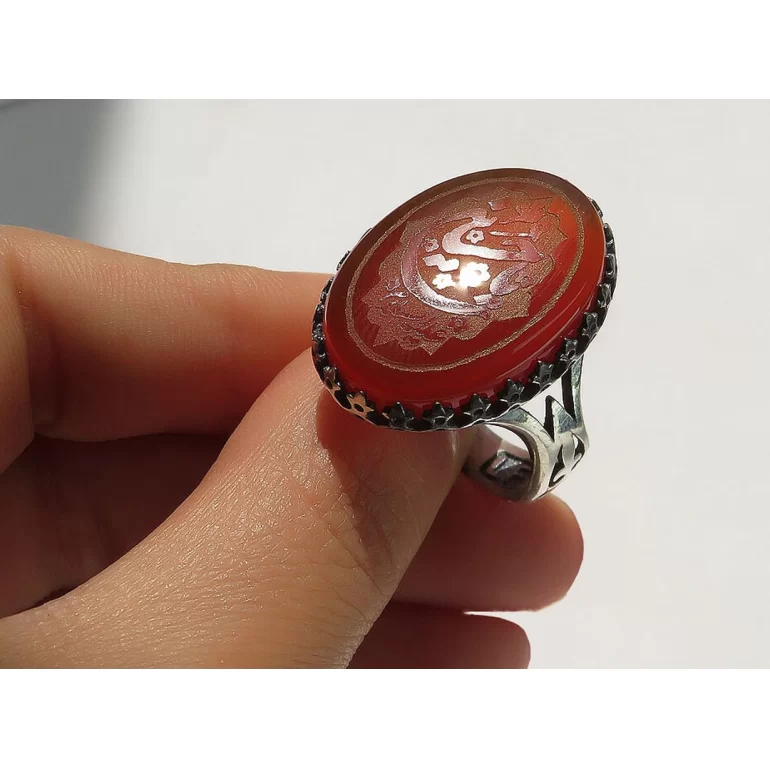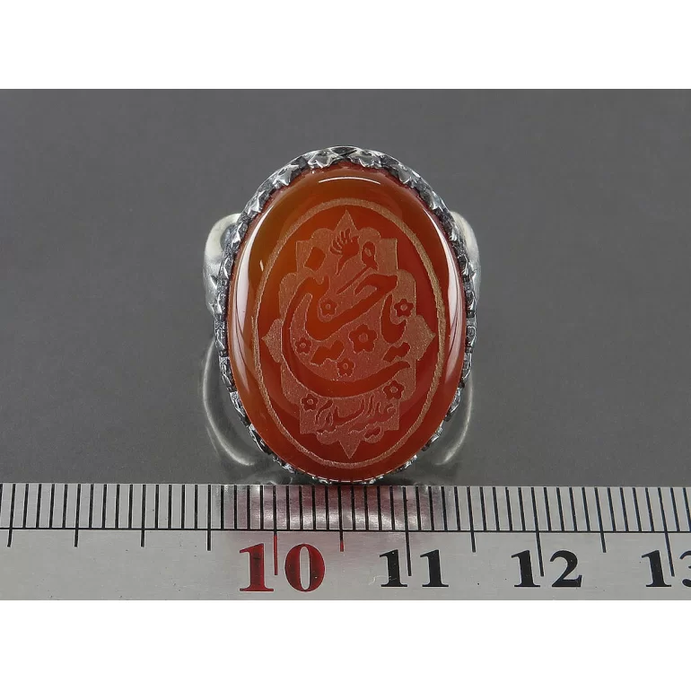 رکاب این انگشتر مردانه از نقره 925 عیار بوده و نگین آن از جنس عقیق قهوه ای با حکاکی یا حسین علیه السلام می باشد. وزن این انگشتر نفیس تقریبا 10 گرم است و به صورت حرفه ای به دست استادکار خبره و باتجربه ساخته می شود