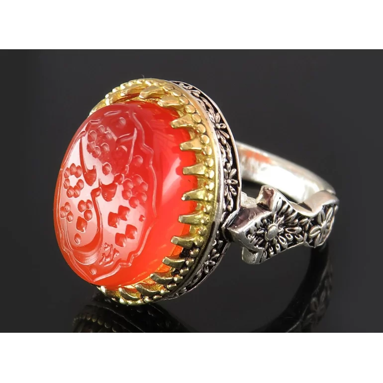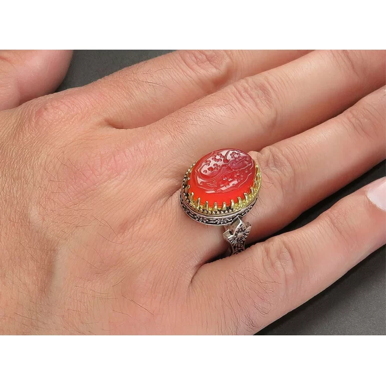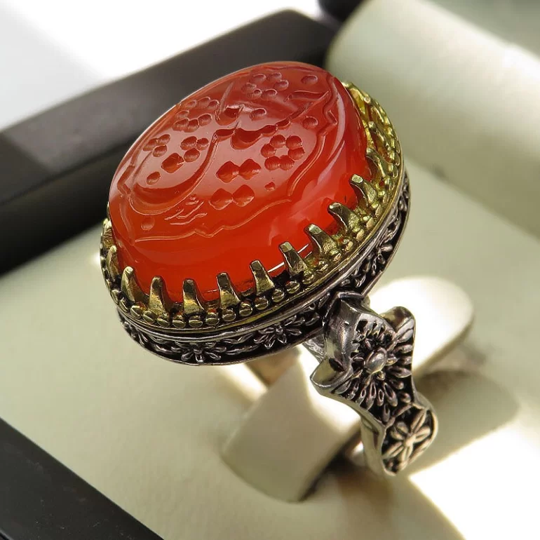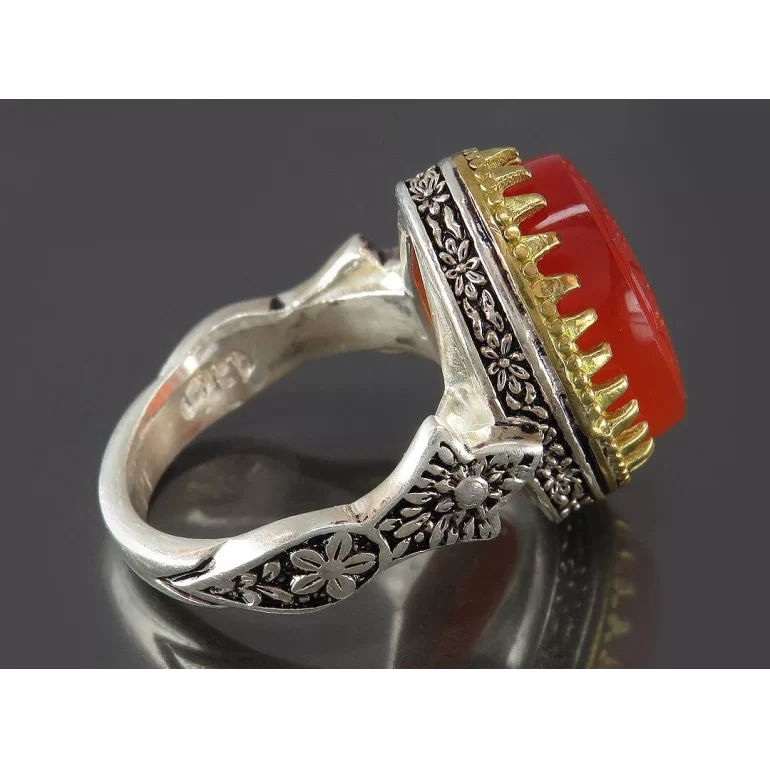 رکاب این انگشتر مردانه از نقره 925 عیار بوده و نگین آن از جنس عقیق قرمز می باشد. وزن این انگشتر نفیس تقریبا 16 گرم است و به صورت حرفه ای به دست استادکار خبره و باتجربه ساخته می شود.