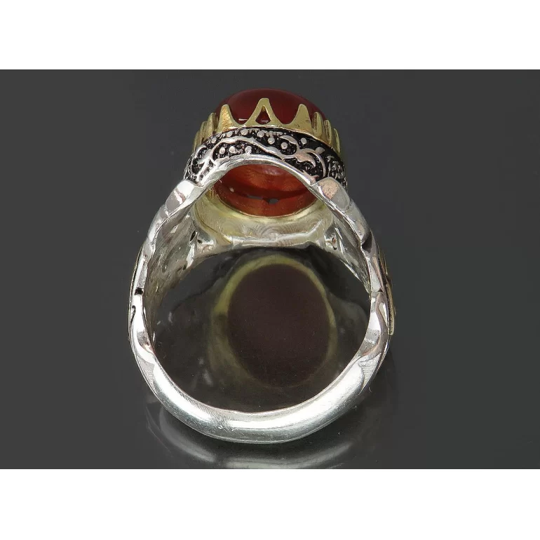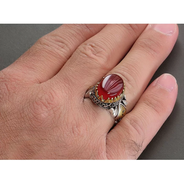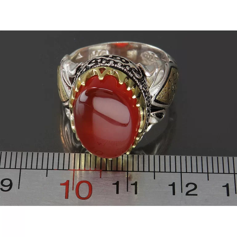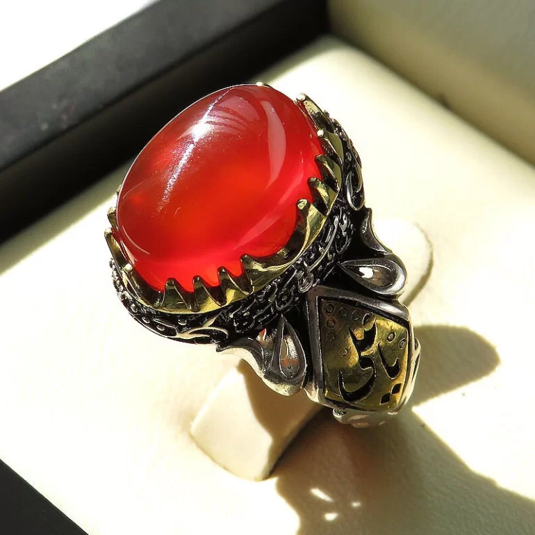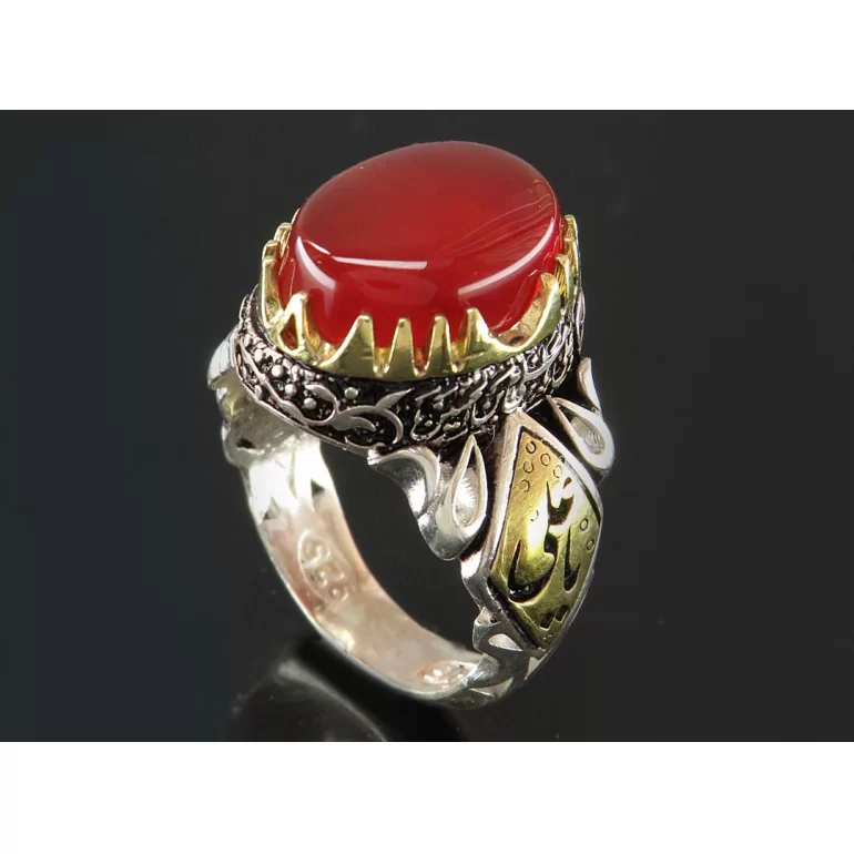 رکاب این انگشتر مردانه از نقره 925 عیار بوده و نگین آن از جنس عقیق قرمز می باشد. وزن این انگشتر نفیس تقریبا 11.5 گرم است و به صورت حرفه ای به دست استادکار خبره و باتجربه ساخته می شود. روی رکاب این انگشتر واژه صلوات امام حسین و یا علی حکاکی شده است