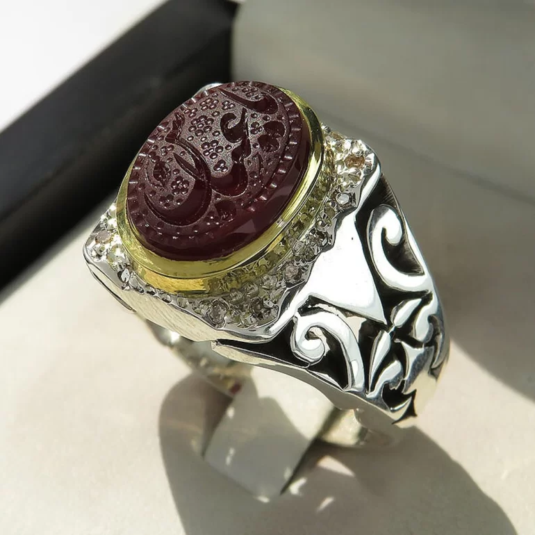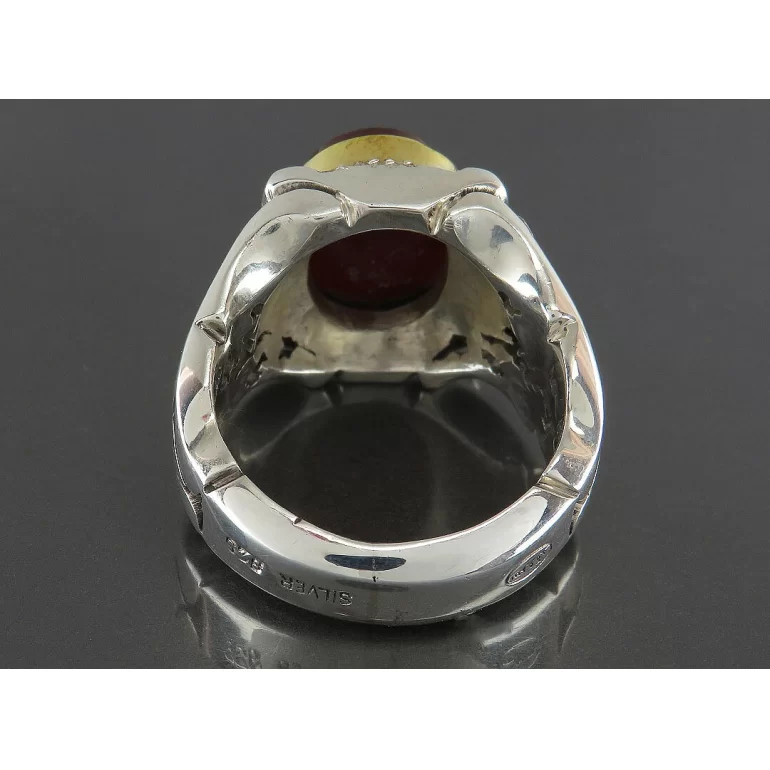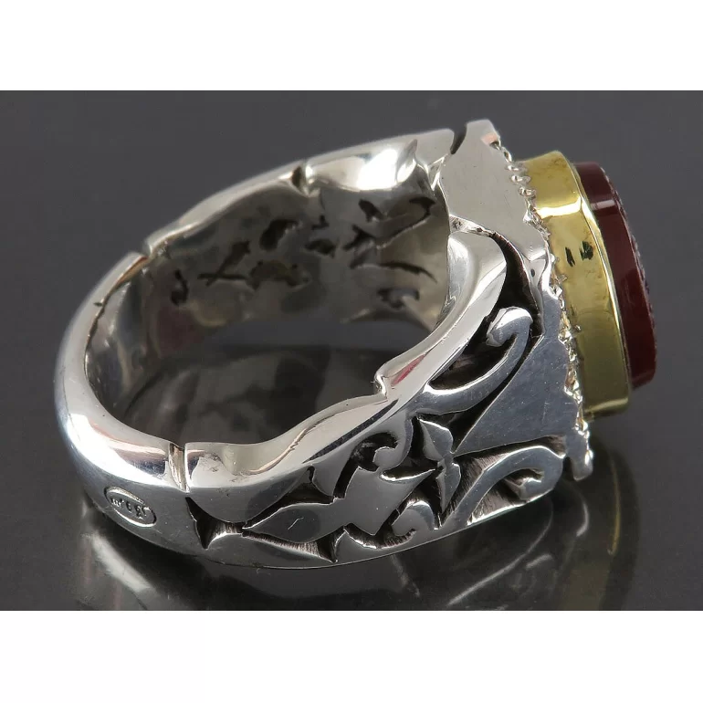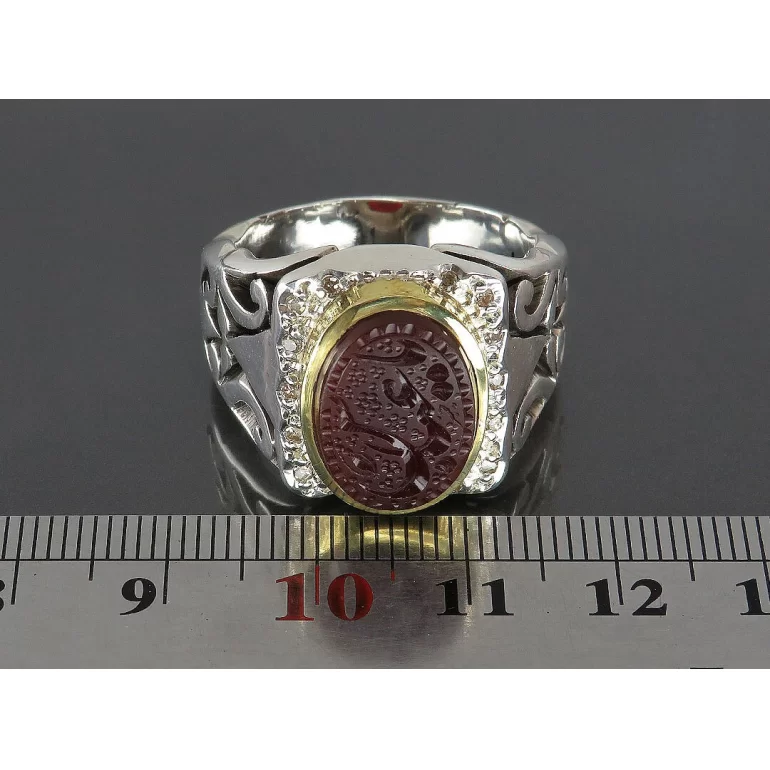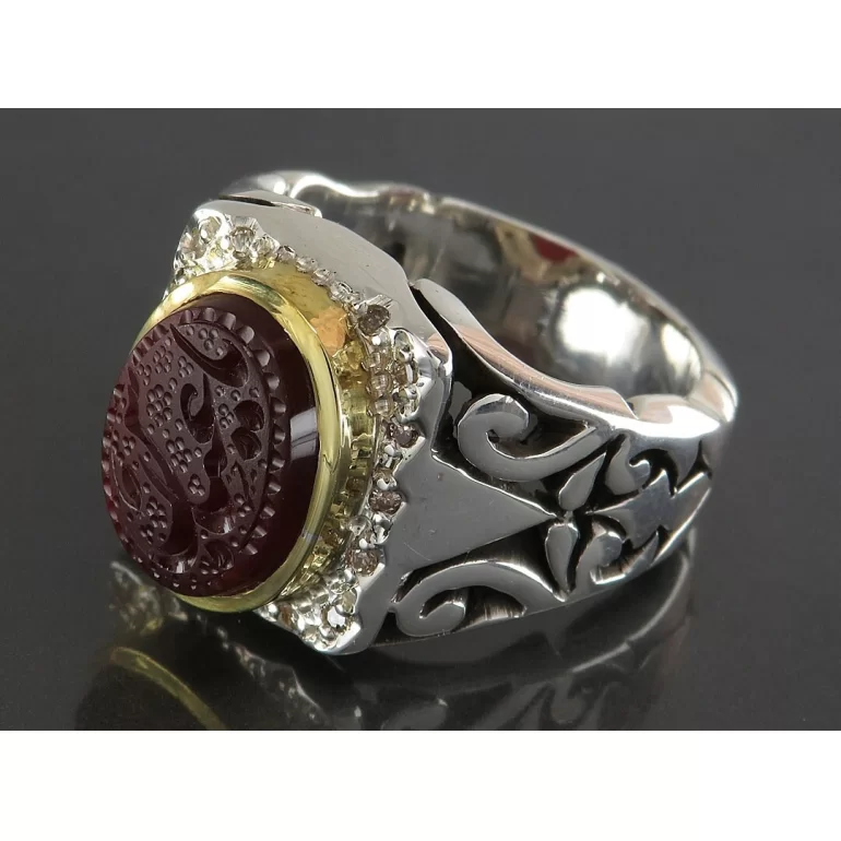 رکاب این انگشتر مردانه از نقره 925 عیار بوده و نگین آن از جنس عقیق یمنی قهوه ای دست ساز با برلیان اصل و حکاکی یا عباس می باشد. وزن این انگشتر نفیس تقریبا 21 گرم است و به صورت حرفه ای به دست استادکار خبره و باتجربه ساخته می شود.