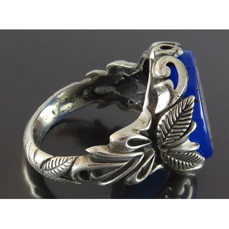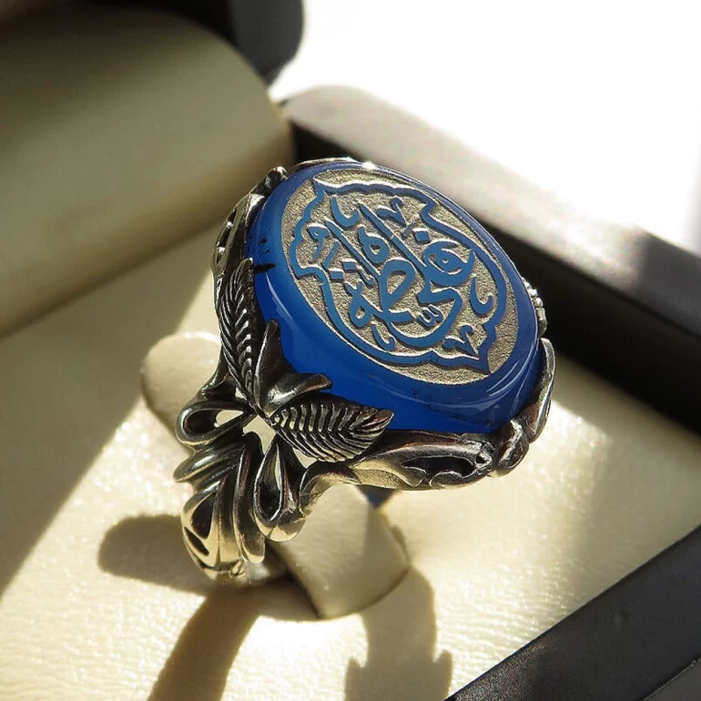 رکاب این انگشتر مردانه از نقره 925 عیار بوده و نگین آن از جنس عقیق آبی حکاکی علی و فاطمه می باشد. وزن این انگشتر نفیس تقریبا 13 گرم است و به صورت حرفه ای به دست استادکار خبره و باتجربه ساخته می شود